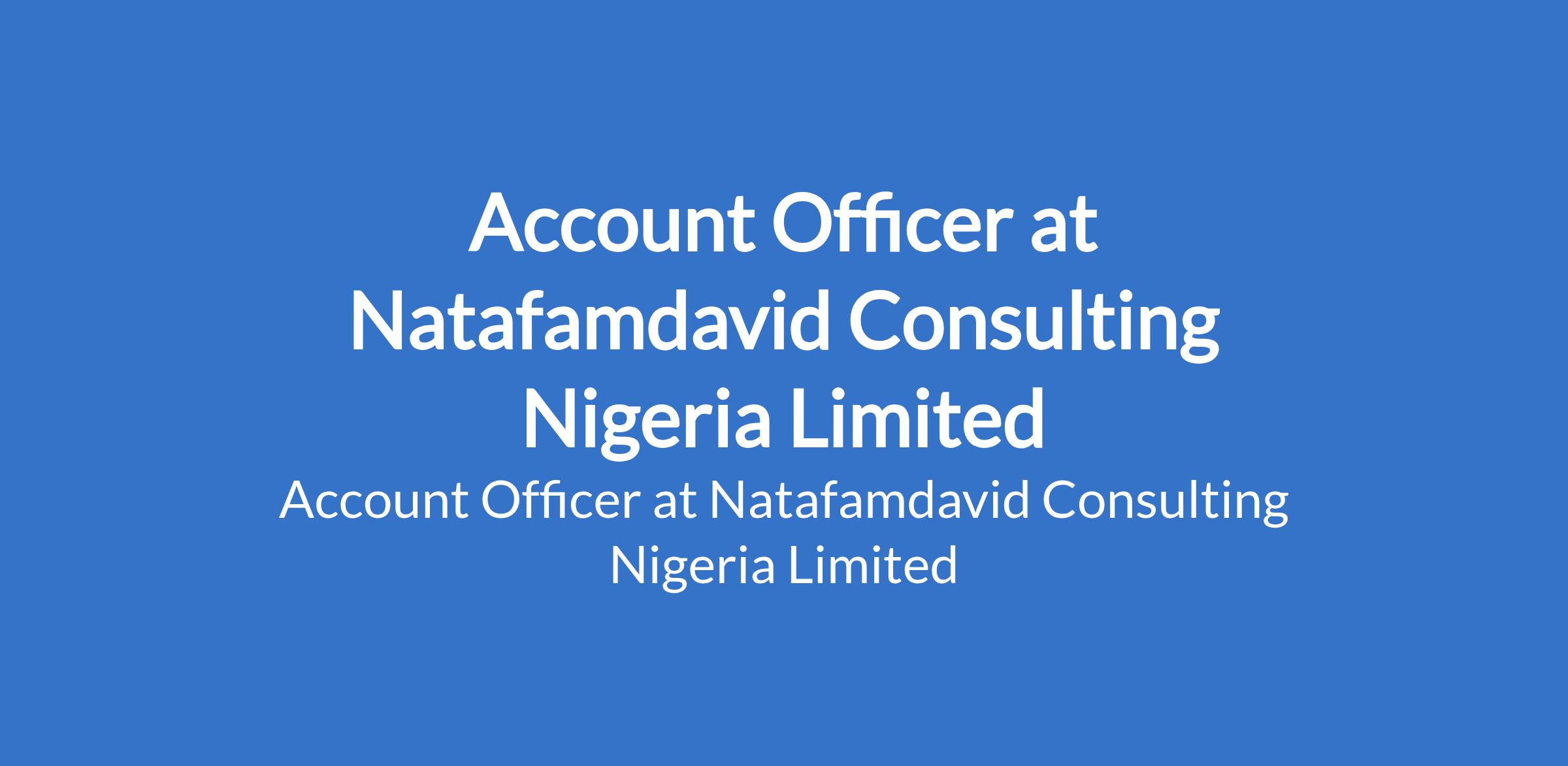 Natafamdavid Consulting Nigeria Limited is recruiting to fill the position of: Account Officer. The position is located in Ikeja, Lagos State. Interested candidates should possess minimum of an HND / B.Sc. in Accounting, Finance, Economics, or related fields with 23 years relevant work experience.