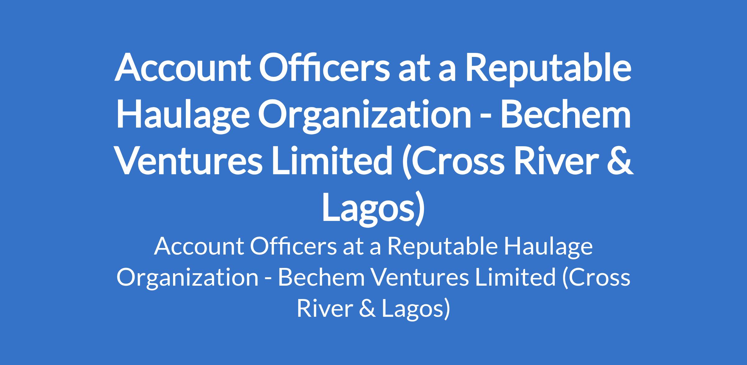Bechem Ventures Limited - Our client, a reputable haulage organization is recruiting to fill the position of: Account Officer. The position is located in Calabar, Cross River and Lagos States. Salary: N150,000 - N500,000 monthly. Interested candidates should possess an HND / Bachelor's Degree with 2 years of experience.
