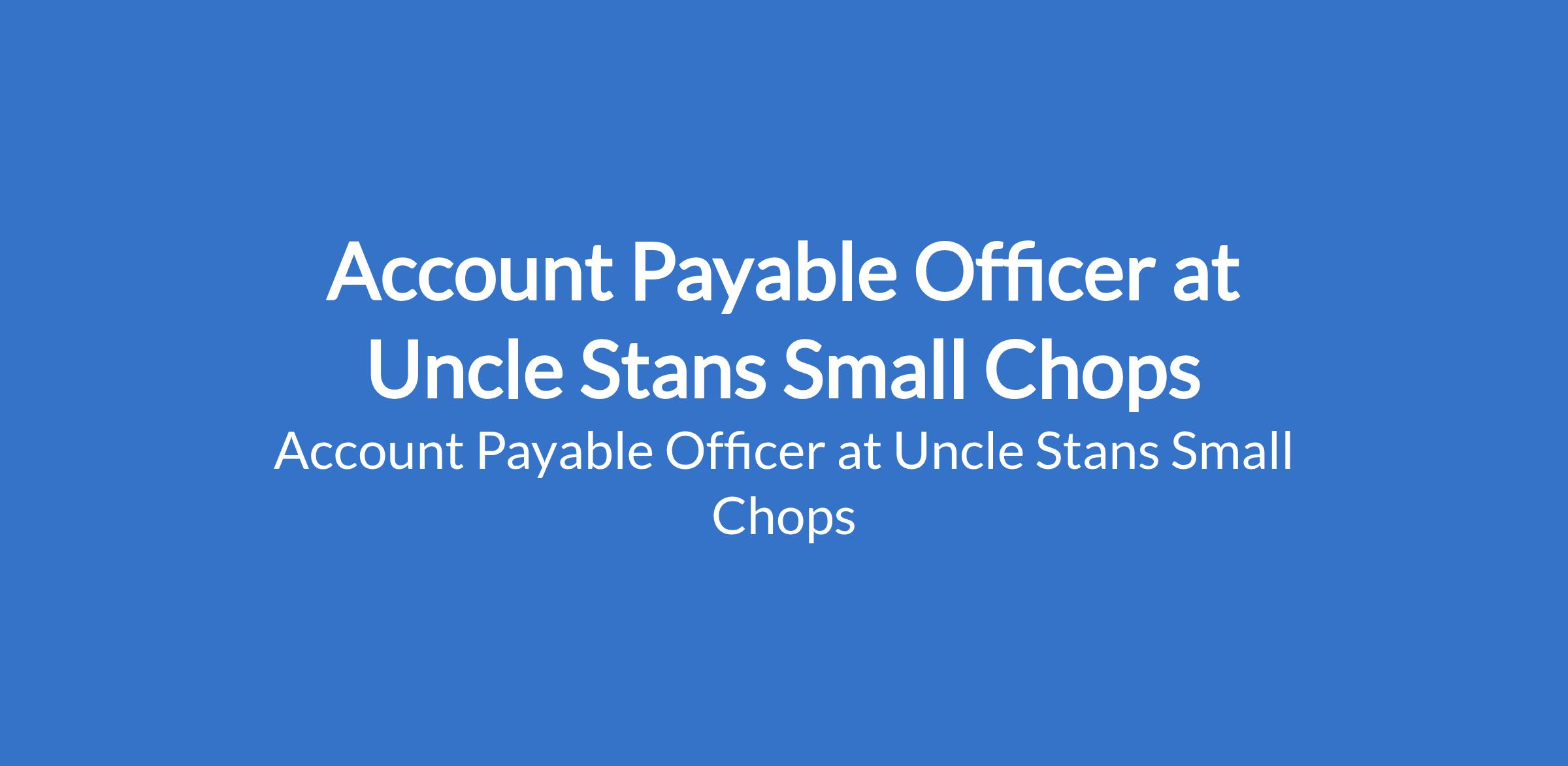 Uncle Stans Small Chops is recruiting to fill the position of: Account Payable Officer. The position is located in Lekki Lagos State. Salary: N200,000 - N250,000 / month. Interested candidates should possess an HND / B.Sc in Accounting, Finance, or a related discipline with 2 4 years strong accounting experience, preferably in a similar role.