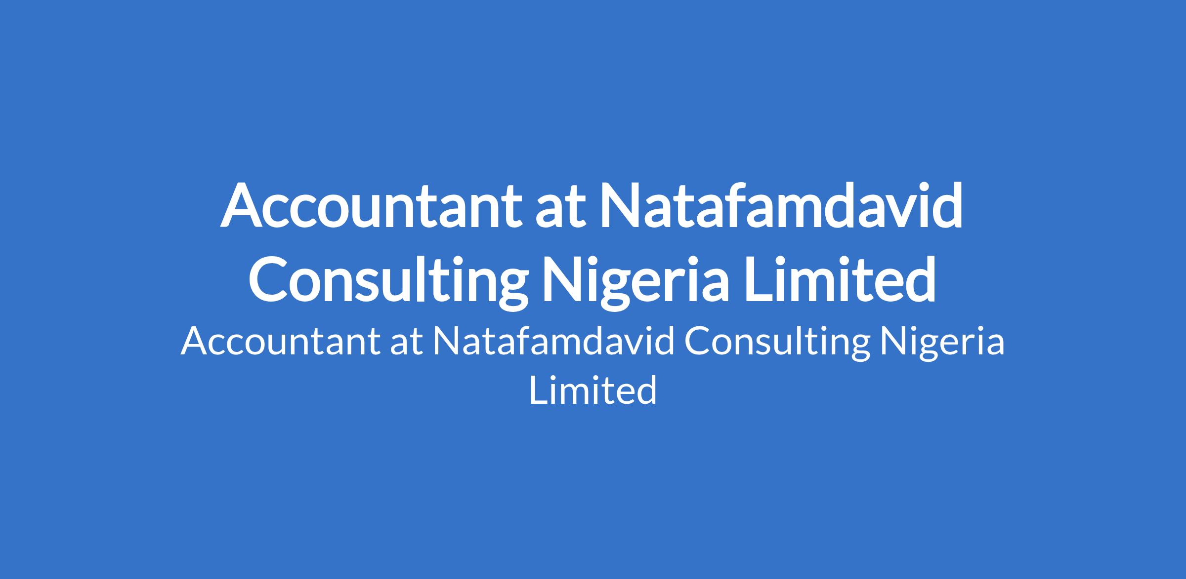 Natafamdavid Consulting Nigeria Limited is recruiting to fill the position of: Accountant. The position is located in Ikeja, Lagos State. Interested candidates should possess a Bachelors Degree in Accounting, Finance, or related field, Professional certification (e.g., ICAN, ACCA) is an added advantage with 35 years accounting experience (media industry experience preferred).