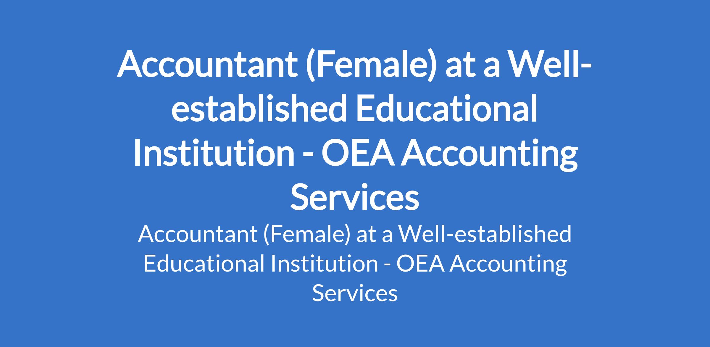 OEA Accounting Services - Our client, a well-established educational institution is recruiting to fill the position of: Accountant (Female). The position is located in Kubwa, Abuja (FCT). Salary: N150,000 - N250,000 monthly. Interested candidates should possess minimum qualification of an HND or Bachelors Degree in Accounting, Finance, or a related discipline with proven experience as an Accounts Officer or similar role.
