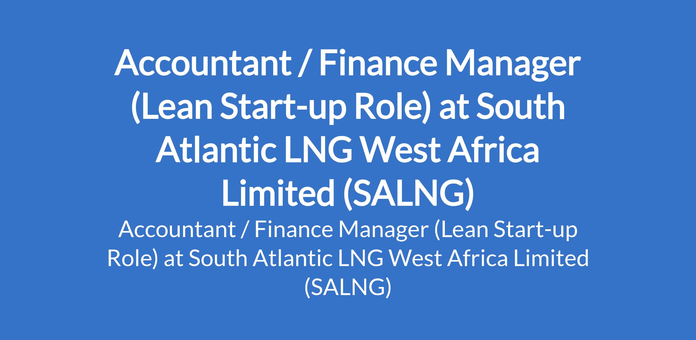 South Atlantic LNG West Africa Limited (SALNG) is recruiting to fill the position of: Accountant / Finance Manager (Lean Start-up Role). The position is located in Lagos State. Salary: N350,000 - N400,000 monthly. Interested candidates should possess a Bachelors Degree in Accounting, Finance, Economics, or a related discipline with 5 - 10 years relevant experience, ideally in a start-up, SME, or project-based business.
