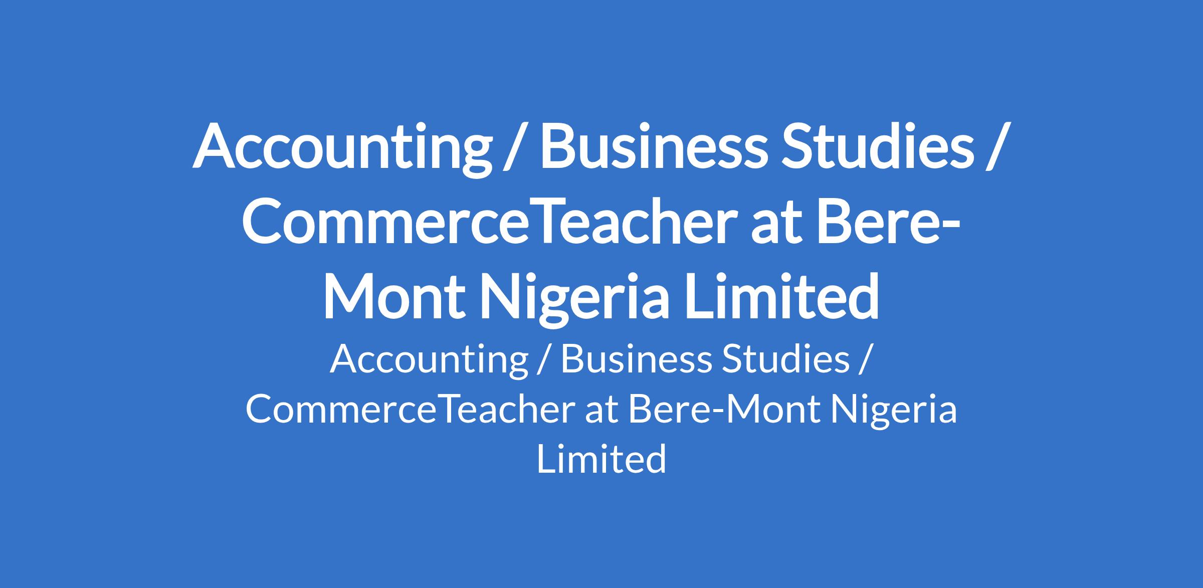 Bere-Mont Nigeria Limited is recruiting to fill the position of: Accounting / Business Studies / CommerceTeacher. Interested candidates should possess a B.Sc / B.Sc + NCE / B.Sc (Ed) / B.Ed / PGDE / M.Ed; Must be a registered member of Teachers Registration Council of Nigeria with a minimum of 3 years of teaching experience in the area of specialization.