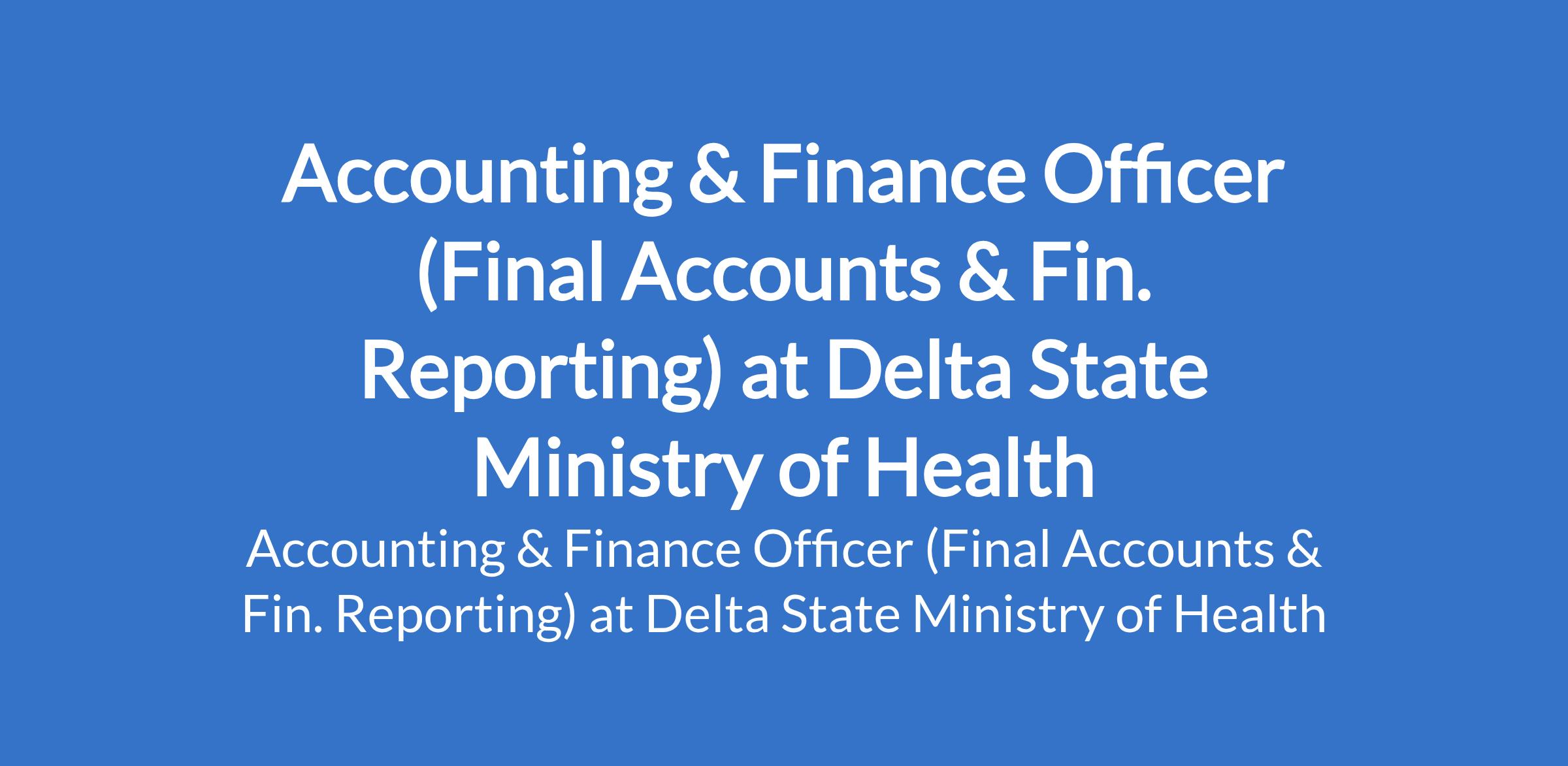 Delta State Ministry of Health is inviting applications from suitable candidates to fill the position of: Accounting & Finance Officer (Final Accounts & Fin. Reporting). Interested candidates should possess a B.Sc. / HND in Accountancy, Accounting Package skills, IPSAS/IFRS competency.