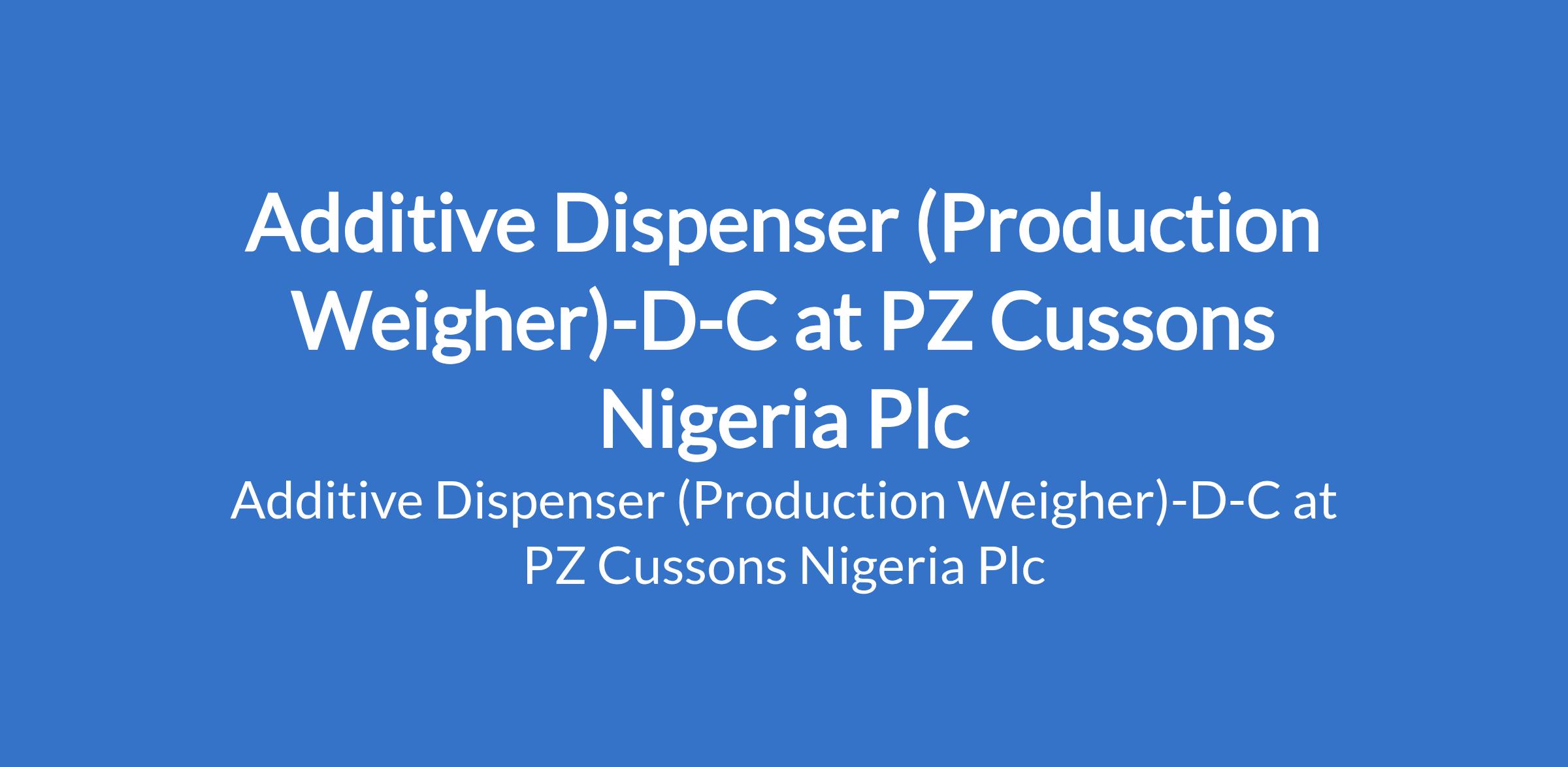 PZ Cussons Nigeria Plc is recruiting to fill the position of: Additive Dispenser (Production Weigher)-D-C. The position is located in Aba, Abia State. Interested candidates should possess a NABTEB / ND / HND qualification in an Engineering related discipline with a minimum of 5 years work experience in a similar position.