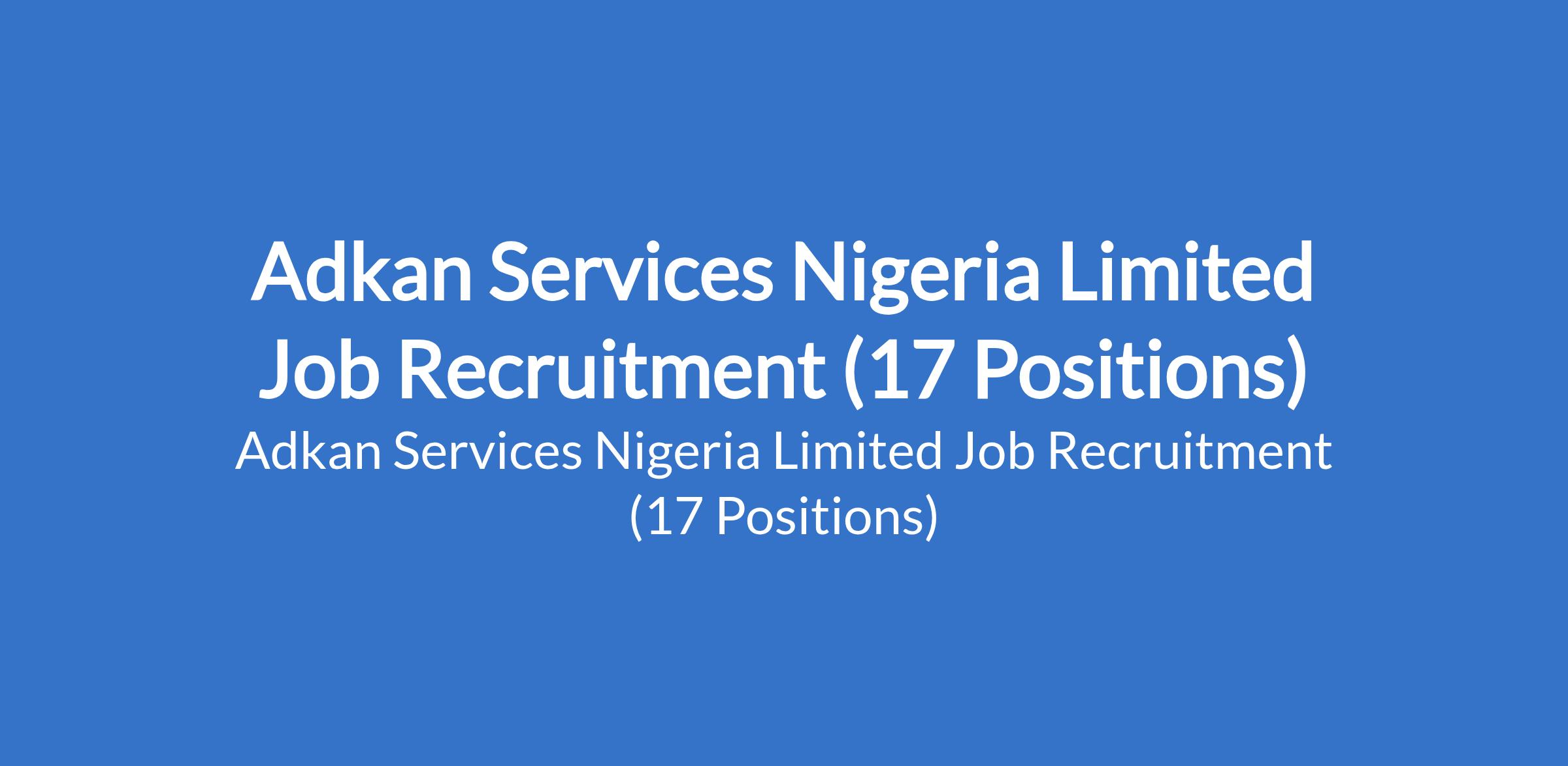 Adkan Services Nigeria Limited is recruiting suitably qualified candidates to fill the following positions in Abuja and Lagos State: Batching Plant Manager, Sub-Contractor, Sales Executive - Bakery, Batching Plant Operator Technician, Storekeeper / Admin Officer, Farm Manager, Mechanical Engineer, Structural Engineer, Quantity Surveyor, Masonry Foreman, General Construction Foreman, General Manager, Marketing Manager, Marketing Officer, Mechanical Engineer, and Electrical Engineer.