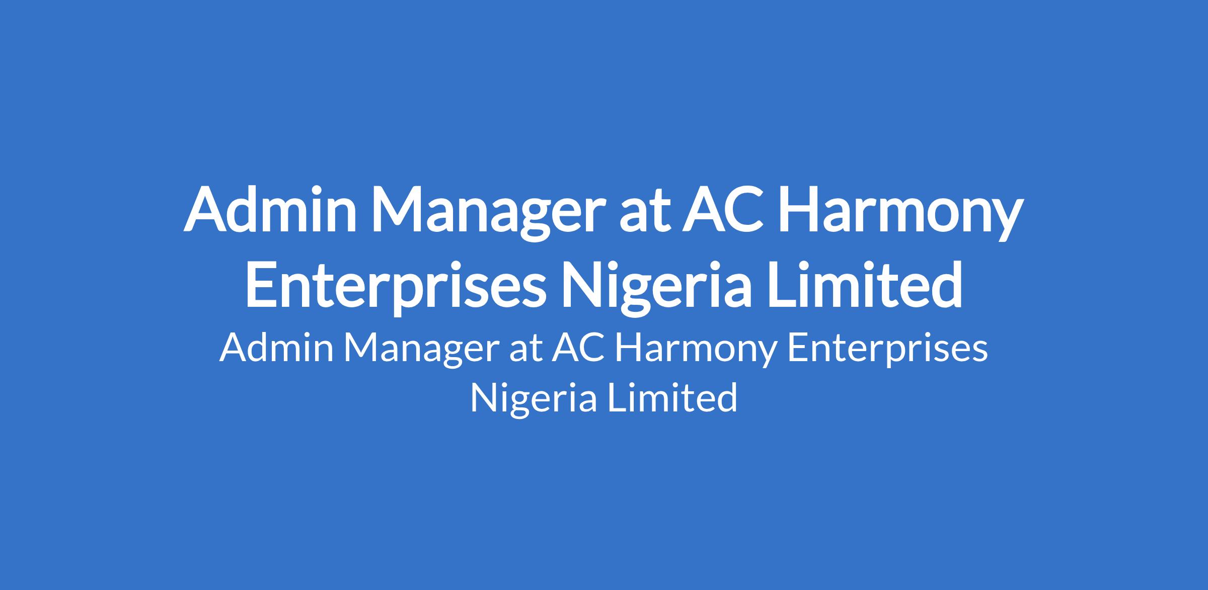 AC Harmony Enterprises Nigeria Limited is recruiting to fill the position of: Admin Manager. The position is located in Iganmu, Lagos State. Salary: N100,000 - N150,000 per month. Interested candidates should possess a Bachelors Degree in Business Administration, Management, or related fields with proven experience in administrative management or a similar role.