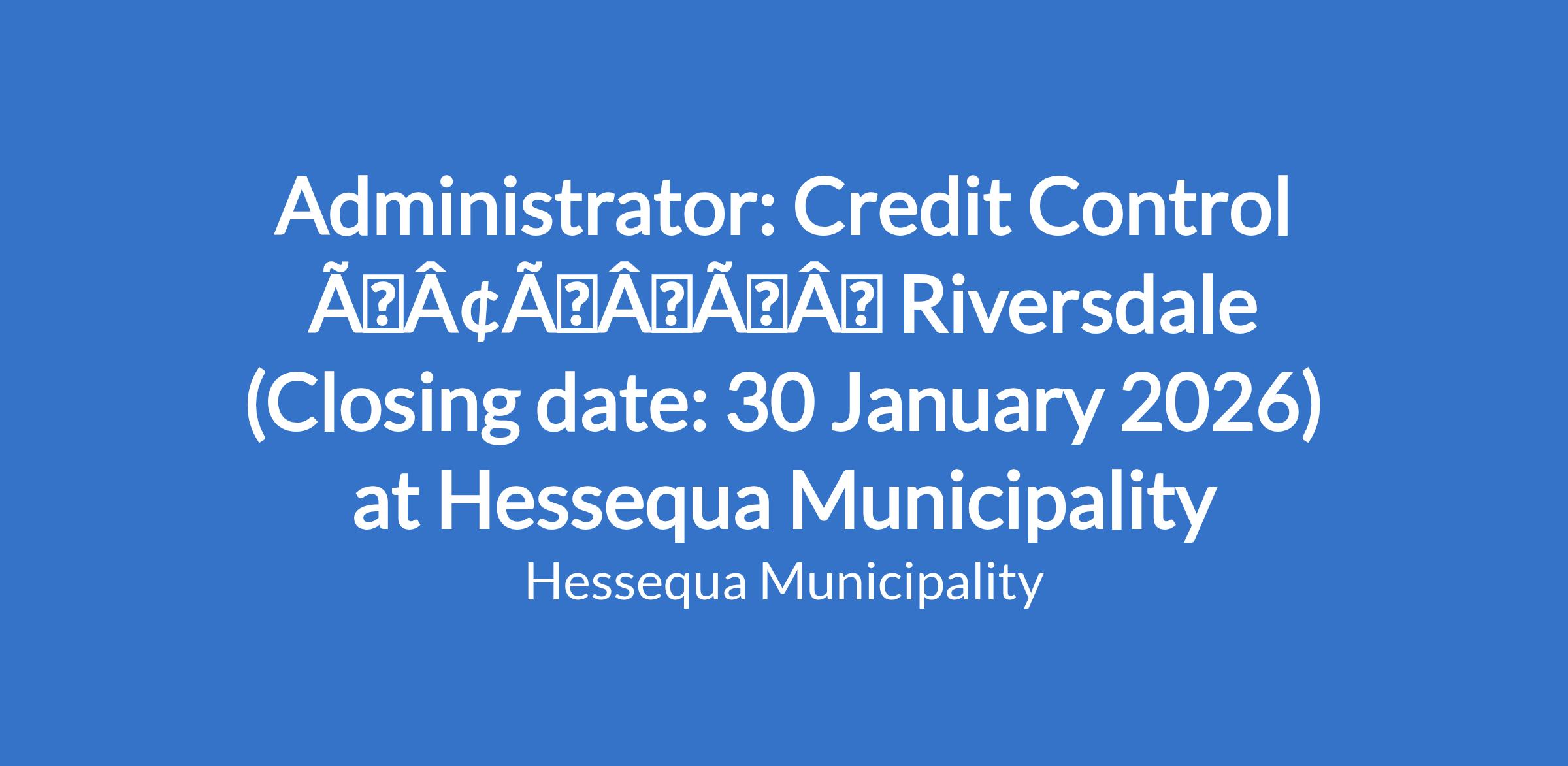 Administrator: Credit Control âÃÂàRiversdale (Closing date: 30 January 2026) at Hessequa Municipality