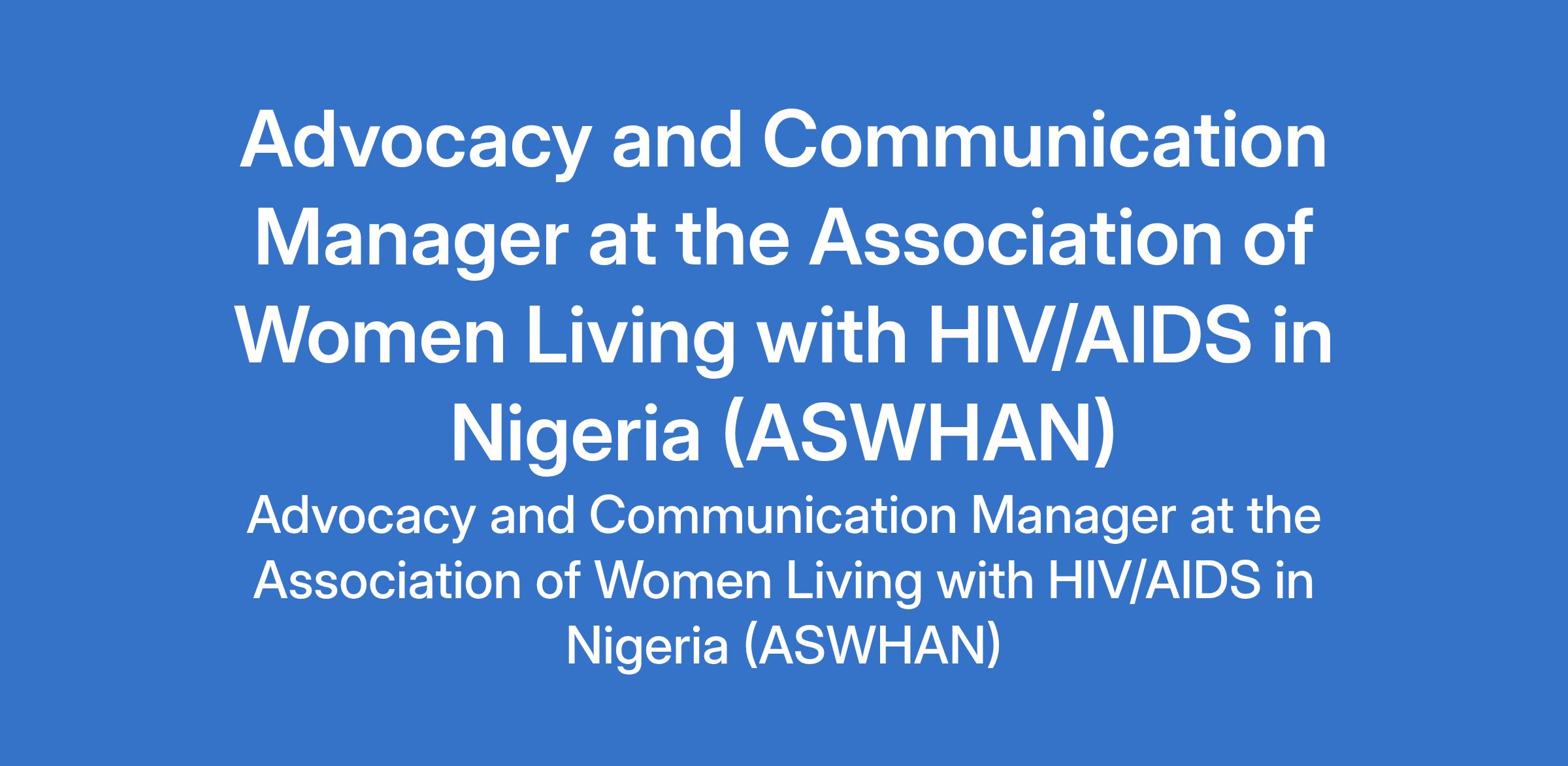 The Association of Women Living with HIV/AIDS in Nigeria (ASWHAN) is recruiting to fill the position of: Advocacy and Communication Manager. The position is located in Abuja. Interested candidates should possess a Bachelors degree in Communications, Public Policy, Development Studies, or related field. with a minimum 7 years experience in advocacy and communications roles.