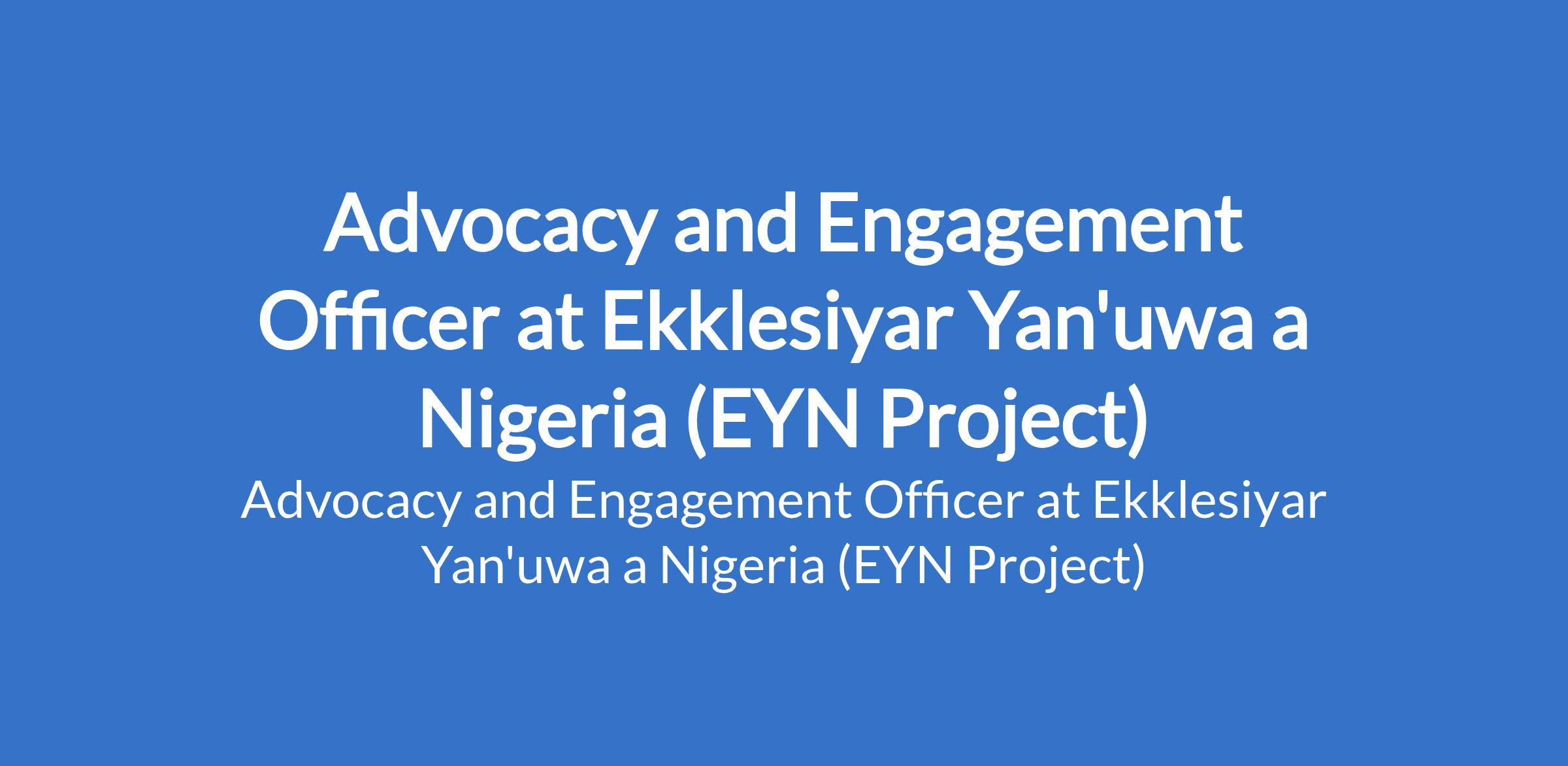 Ekklesiyar Yan'uwa a Nigeria (EYN Project) is recruiting to fill the position of: Advocacy and Engagement Officer. The position is located in Borno State. Interested candidates should possess a Bachelors Degree in Social Sciences, Development Studies, Political Science, Communications, International Relations, or related fields with 35 years of relevant experience in advocacy, community engagement, or communications in humanitarian or development contexts.