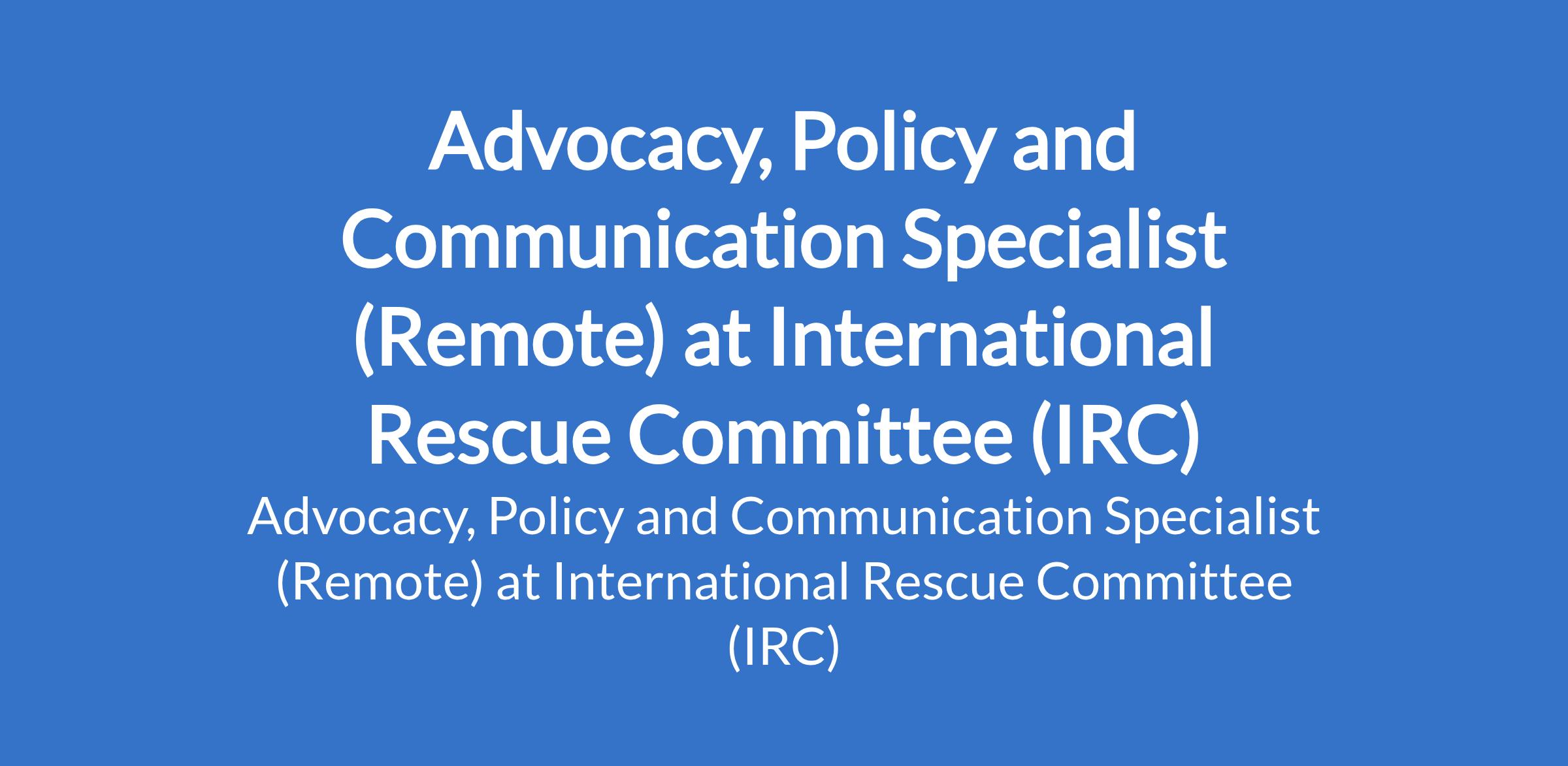 International Rescue Committee (IRC) is recruiting to fill the position of: Advocacy, Policy and Communication Specialist. This is a Remote job. Interested candidates should possess a Degree in Law, Government, Political Science, International Relations, Strategic Studies, or a related discipline with 6-8 years of experience working on humanitarian, development and/or foreign policy issues.