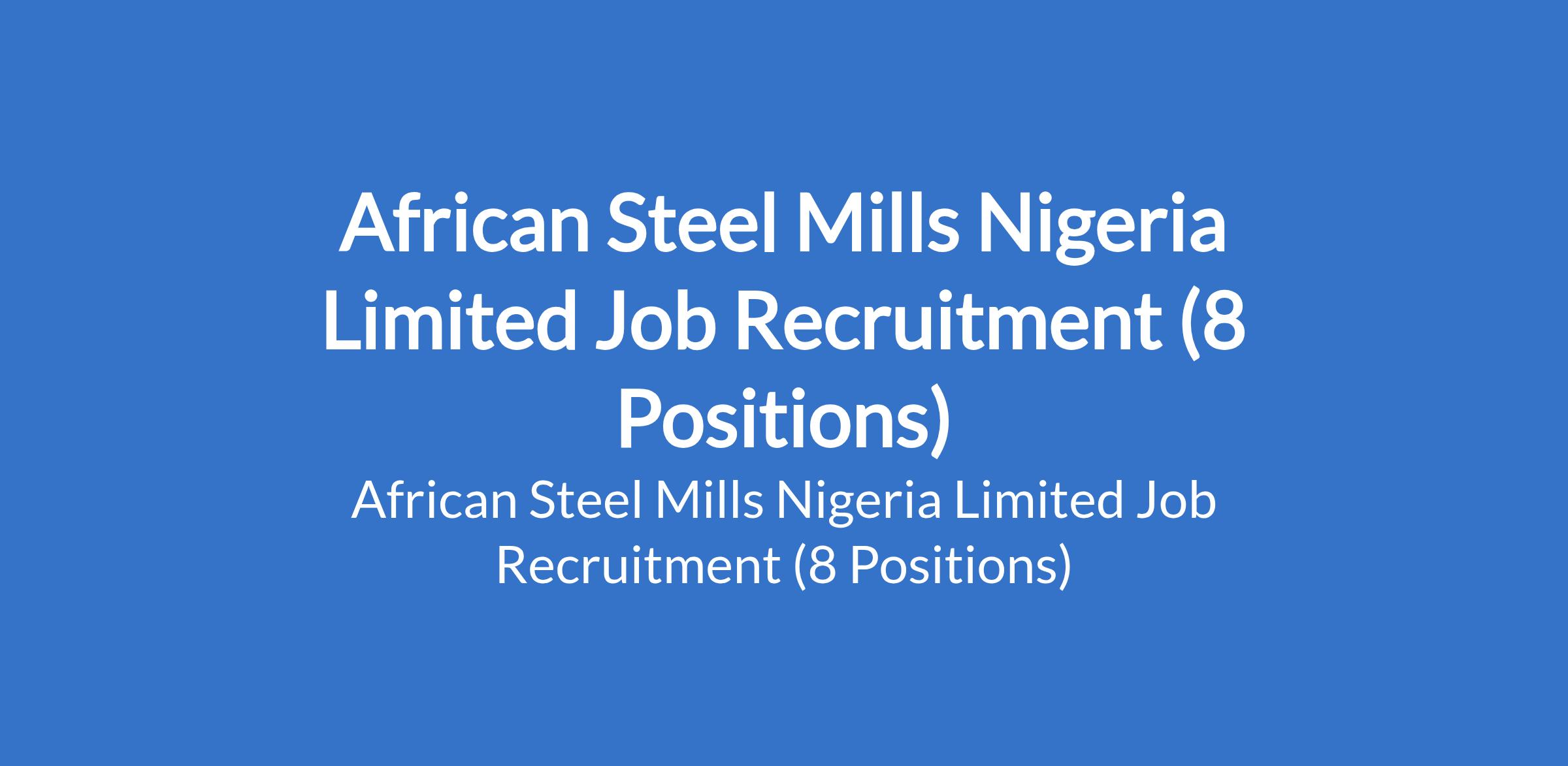African Steel Mills Nigeria Limited is currently recruiting suitably qualified candidates to fill the following positions in Lagos State: Magnet Crane Operator, Draughtsman, Electrical Engineer (Maintenance), Electrical Engineer, Vulcanizer , Sales & Marketing Executive TRG Roofing Sheets, Air Conditioning (AC) Technician, and Electrical Engineer (Maintenance).