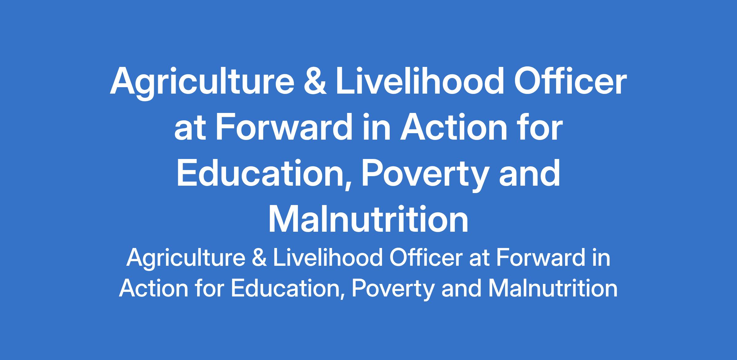 Forward in Action for Education, Poverty and Malnutrition is recruiting to fill the position of: Agriculture & Livelihood Officer. The position is located in Bauchi and Kebbi States. Interested candidates should possess a Bachelors Degree in Agronomy, Agriculture, Agribusiness and Evaluation with at least three (3) years experience in agronomy, agricultural markets and value chain development, business planning.