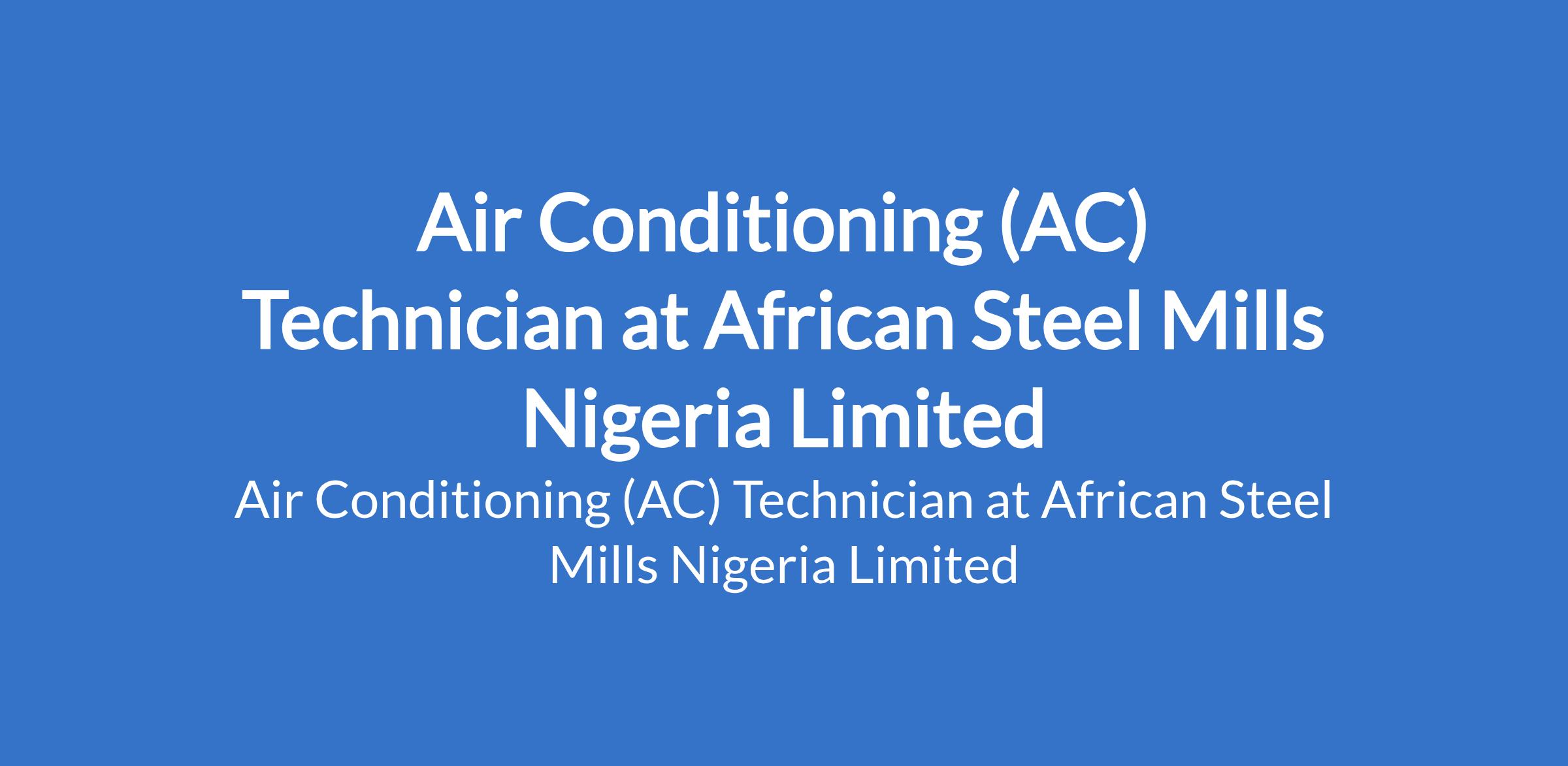 African Steel Mills Nigeria Limited is recruiting to fill the position of: Air Conditioning (AC) Technician. The position is located in Ikorodu, Lagos State. Interested candidates should possess a minimum of SSCE, Trade Test, or Technical Certification in Air Conditioning / Refrigeration with 24 years of experience as an AC Technician, preferably in a manufacturing or industrial environment.