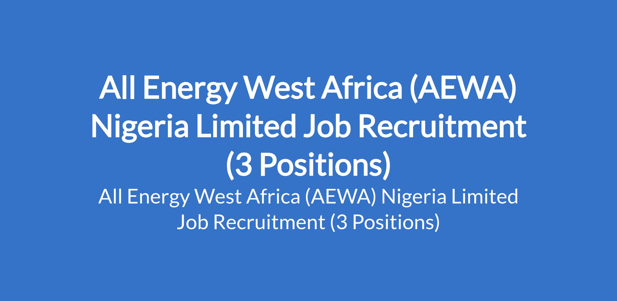 All Energy West Africa (AEWA) Nigeria Limited is recruiting suitably qualified candidates to fill the following positions in Rivers State: Mechanical Engineer - General, Maintenance Support Engineer (Non-Plant Asset), and Senior Process Assurance Engineer.