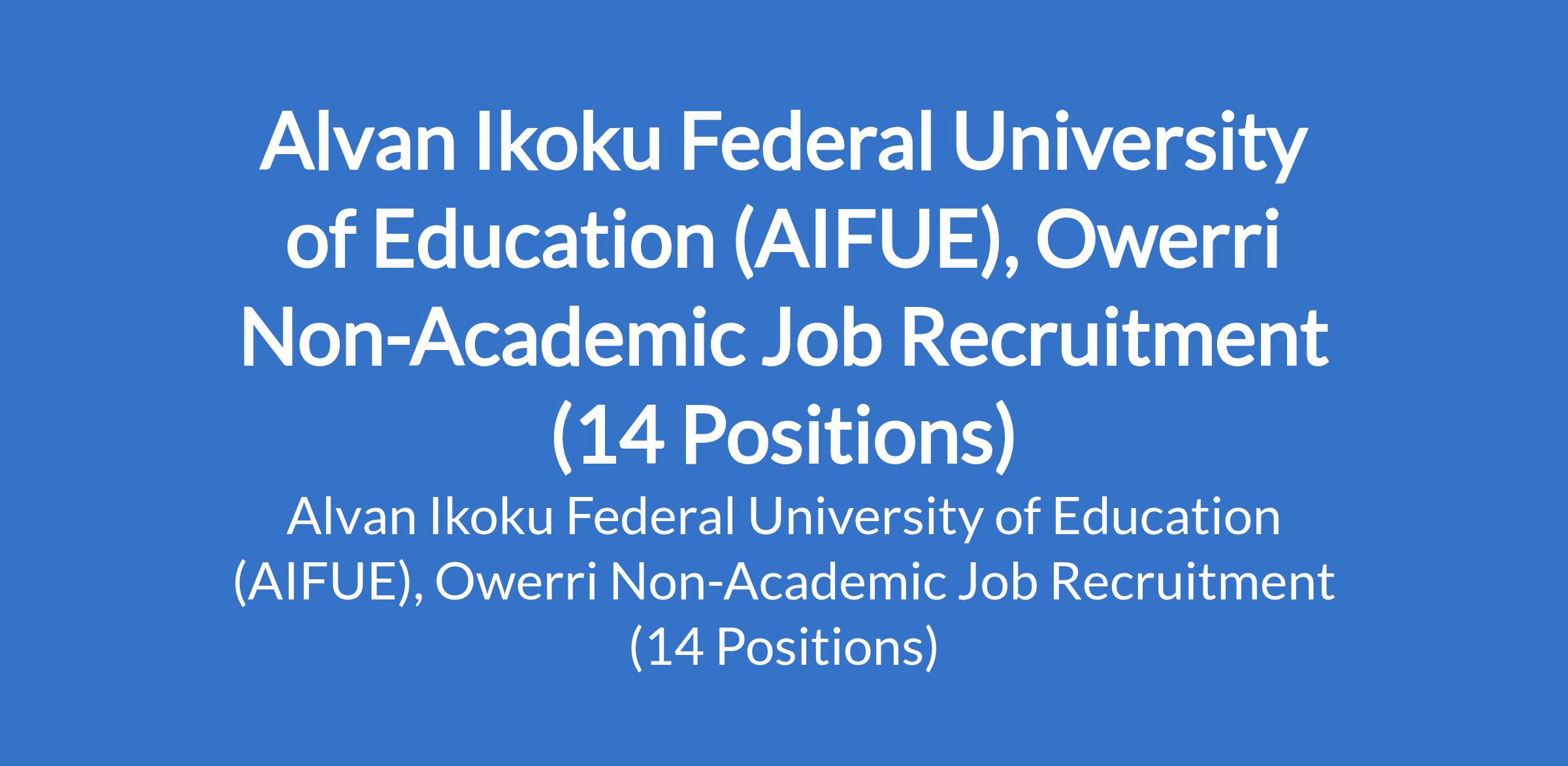 Alvan Ikoku Federal University of Education (AIFUE), Owerri invites applications from suitably qualified candidates for the following positions: Engineer, Medical Officer, Medical Scientist, Technologist, Nursing Officer, Confidential Secretary, Administrative Officer, Statistician, Planning Officer, Motor Driver / Mechanic, Lab Attendant, Data Processing Analyst, Accountant I, and Accountant II.