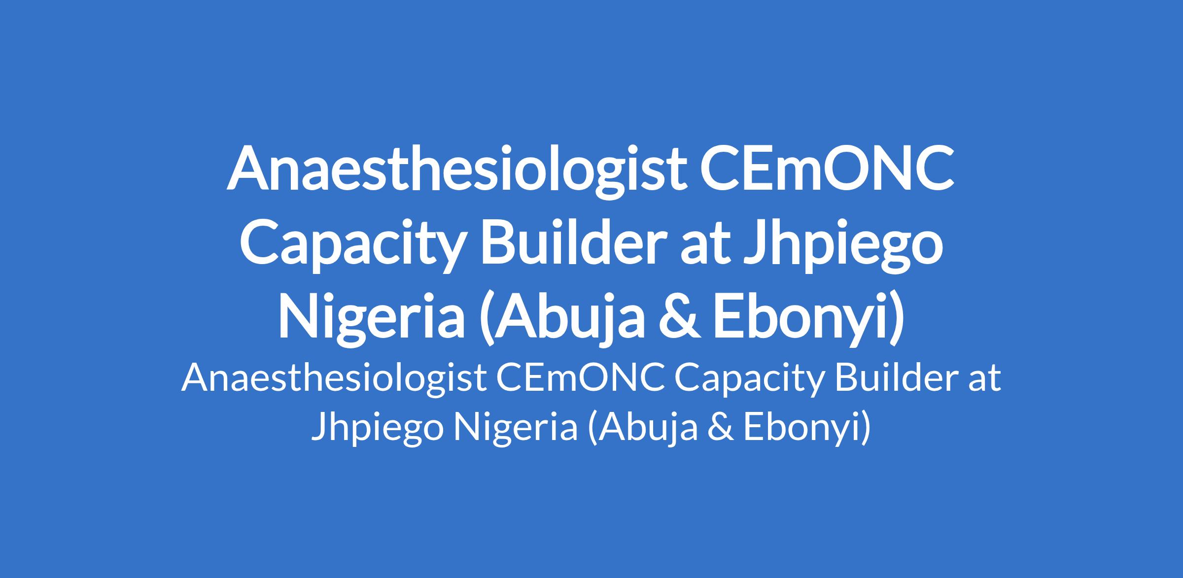 Jhpiego Nigeria is recruiting to fill the position of: Anaesthesiologist CEmONC Capacity Builder. The position is located in Abuja and Abakaliki - Ebonyi State. Interested candidates must be a Registered and practicing anaesthesiologist with at least 5 years post-qualification working experience.