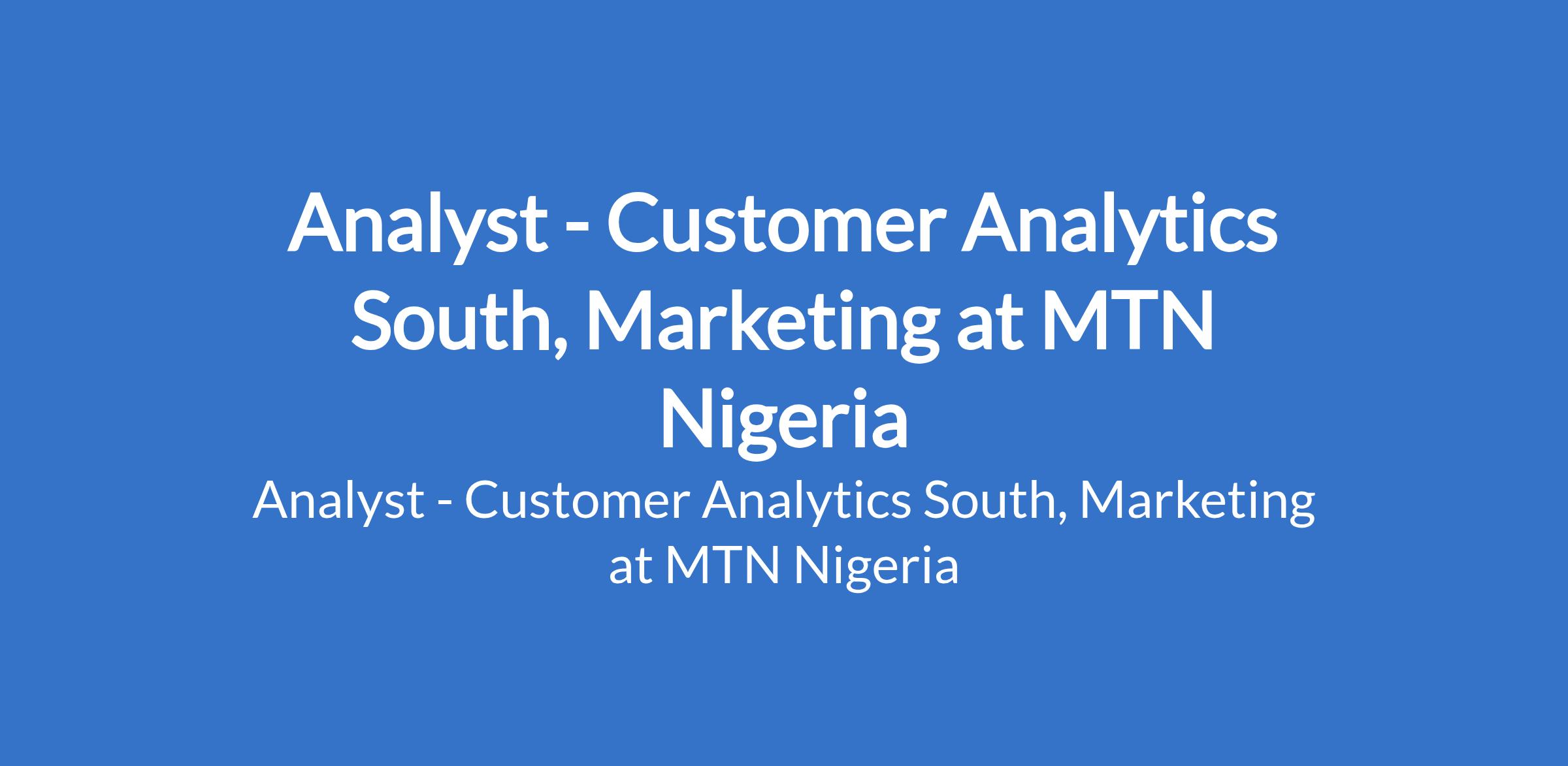 MTN Nigeria is recruiting to fill the position of: Analyst - Customer Analytics South, Marketing. The position is located in Ikoyi, Lagos State. Interested candidates should possess a First Degree in Economics, Statistics, Mathematics, Computer science, Engineering, or any related field with 3-7 years working experience.