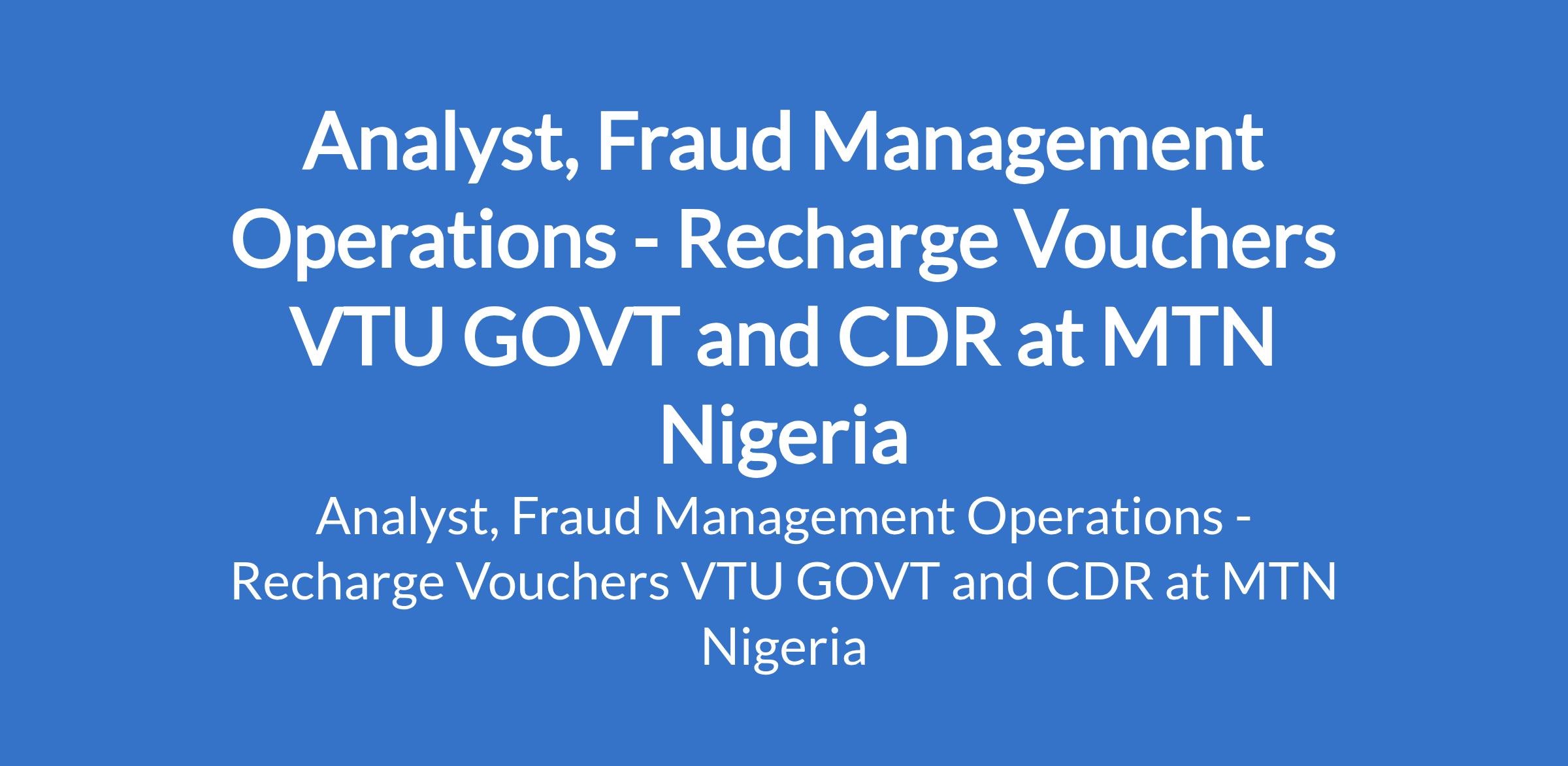 MTN Nigeria is recruiting to fill the position of: Analyst, Fraud Management Operations - Recharge Vouchers VTU GOVT and CDR. The position is located in Ikoyi, Lagos State. Interested candidates should possess a First Degree in any related discipline with 3 - 7 years experience in an area of specialization