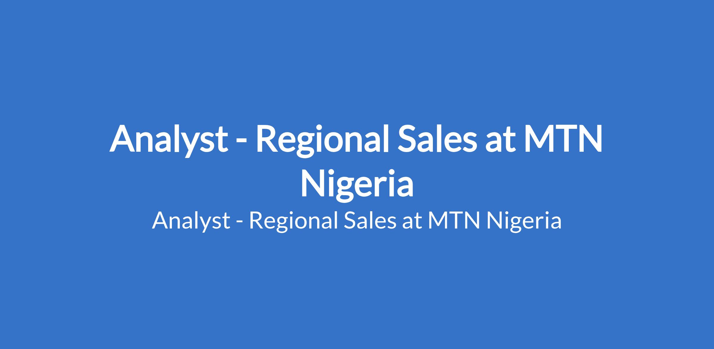 MTN Nigeria is recruiting to fill the position of: Analyst - Regional Sales. The position is located in Ikoyi, Lagos State. Interested candidates should possess a First Degree in Economics, Business Administration, Actuarial science or any related discipline with 3-7 years experience in Data Analytics / Management and / or Processes Management.