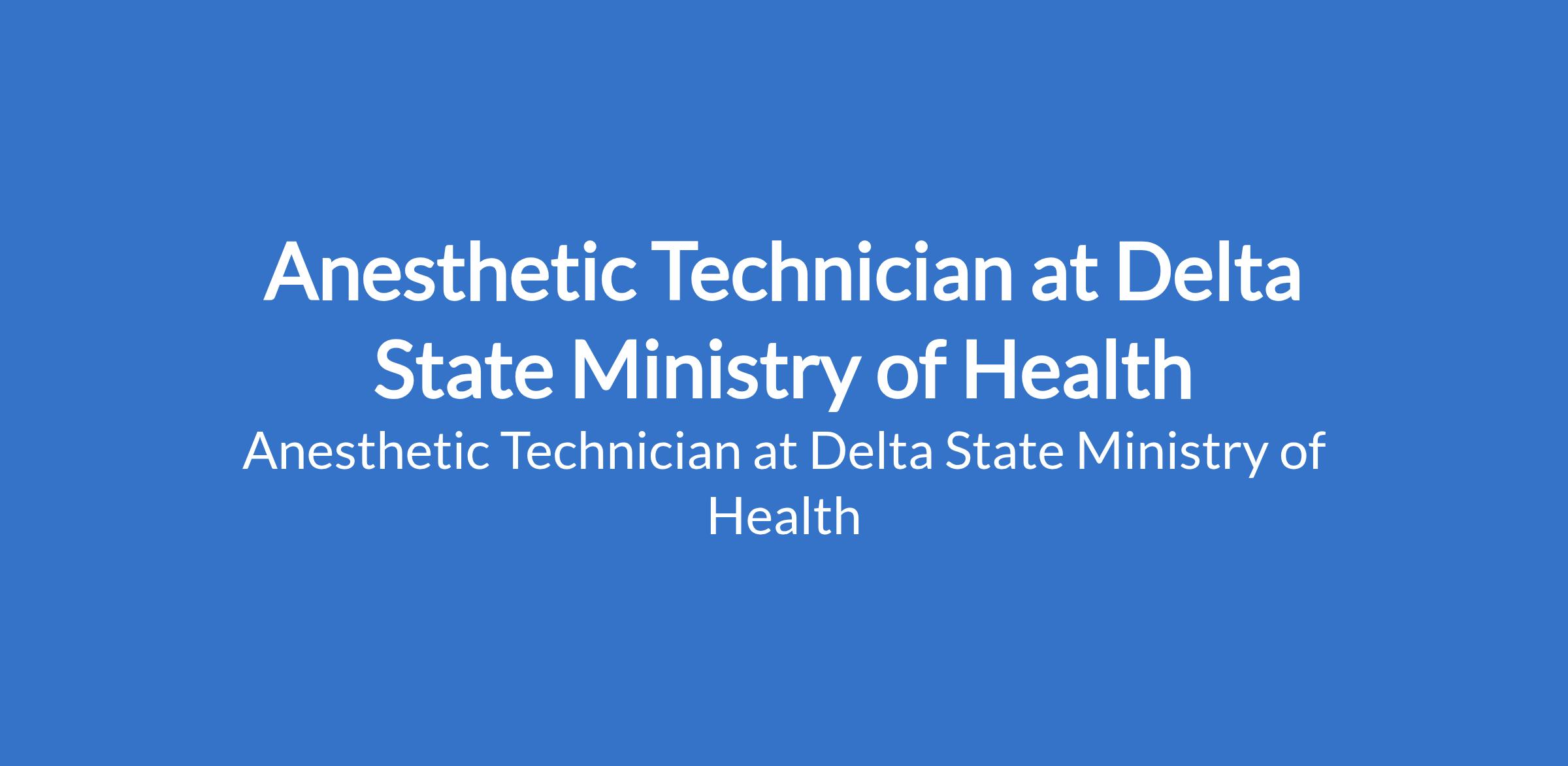 Delta State Ministry of Health is inviting applications from suitable candidates to fill the position of: Anesthetic Technician. Interested candidates should possess an SSCE 5 credit or its equivalent and an OND certificate in Anaesthesia or its equivalent from a recognized school of Health Technology/Training Institution.