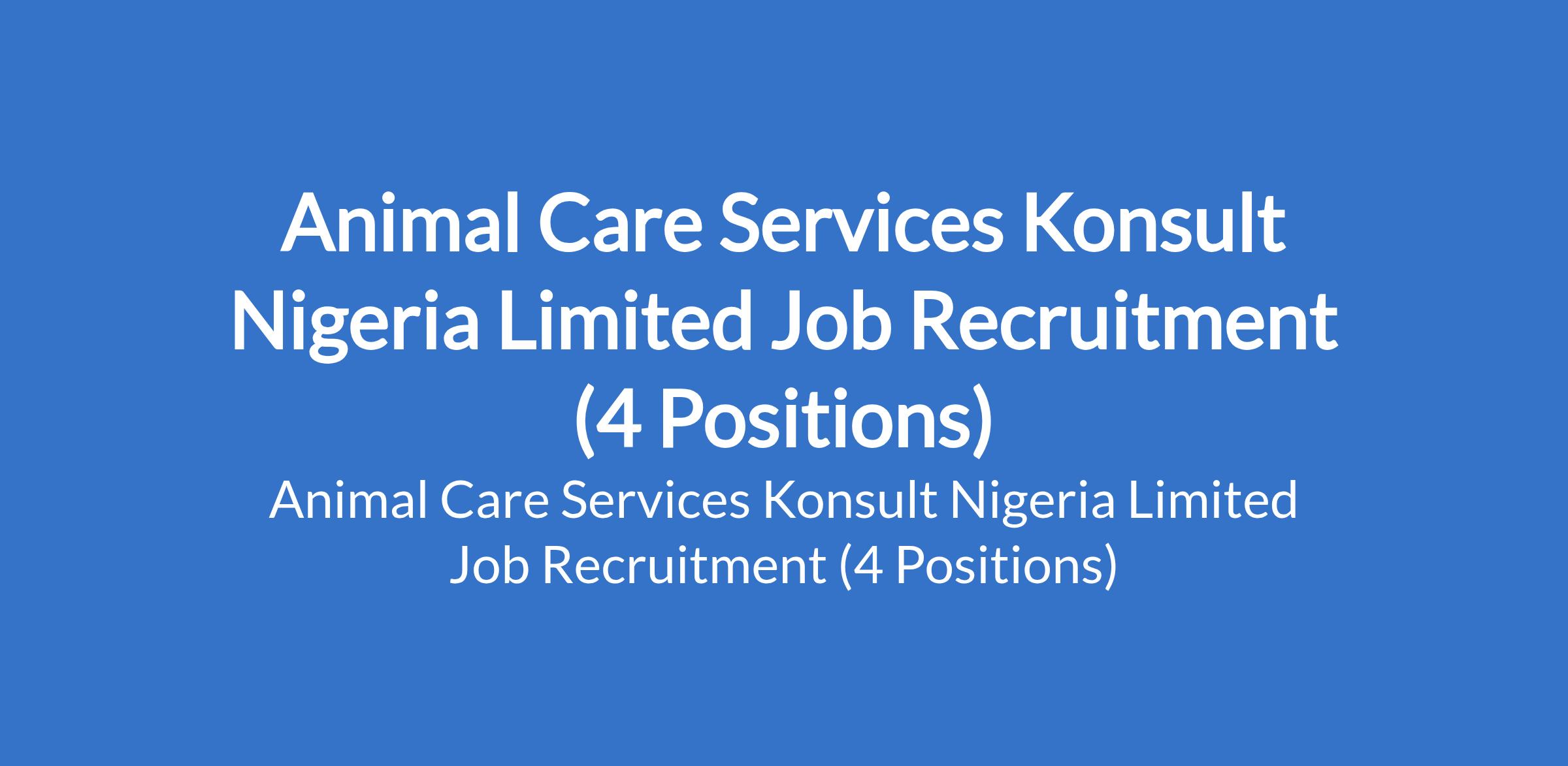 Animal Care Services Konsult Nigeria Limited is recruiting suitable candidates to fill the following positions in Ogun State:Customer Service Manager, Quality Control Officer Feed Analysis Laboratory, Senior Farm Manager (DVM), and Sales Manager - Feeds.
