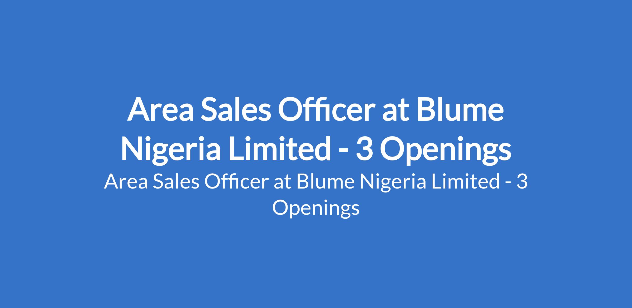 Blume Nigeria Limited is recruiting to fill the position of: Area Sales Officer. The position is located in Niger, Kwara & Lagos States. Interested candidates should possess a Bachelors Degree in Business Administration, Marketing, Economics, or related fields with 3 5years of experience in sales, preferably in FMCG, telecommunications, or consumer goods.