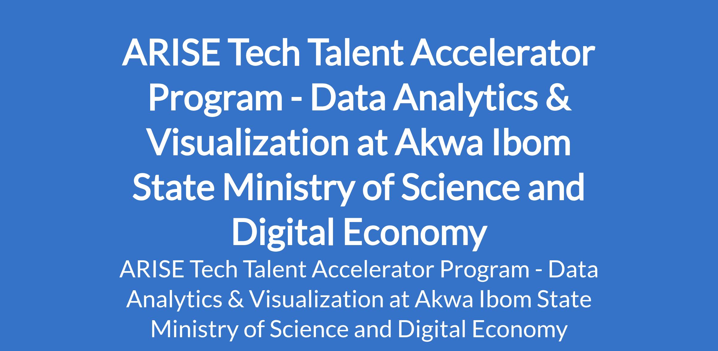 Akwa Ibom State Government through the Ministry of Science and Digital Economy invites applications from suitable candidates for its ARISE Tech Talent Accelerator Program - Data Analytics & Visualization. Interested candidates should possess any of the following Degrees: Master of Science (M.Sc), Master of Arts (MA), Bachelor of Laws (L.LB), Bachelor of Engineering (B.Eng), and Bachelor of Science (B.Sc).