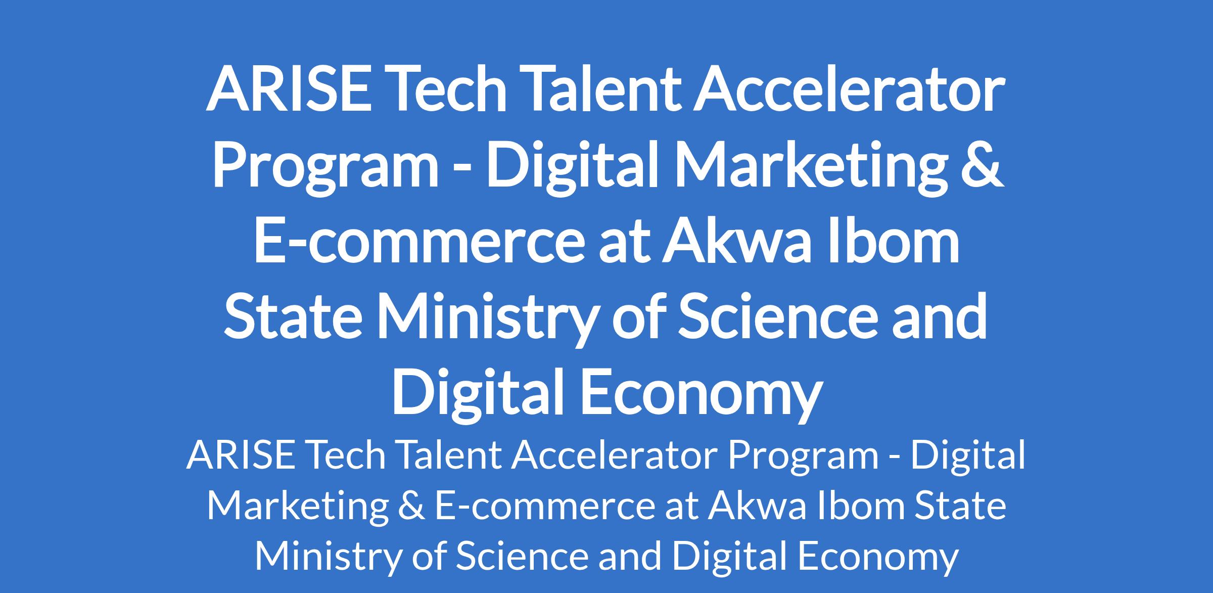 Akwa Ibom State Government through the Ministry of Science and Digital Economy invites applications from suitable candidates for its ARISE Tech Talent Accelerator Program - Digital Marketing & E-commerce. Interested candidates should possess any of the following Degrees: Master of Philosophy (M.Phil), Master of Business Administration, (MBA), Master of Science (M.Sc), Master of Arts (MA), and Bachelor of Laws (L.LB).