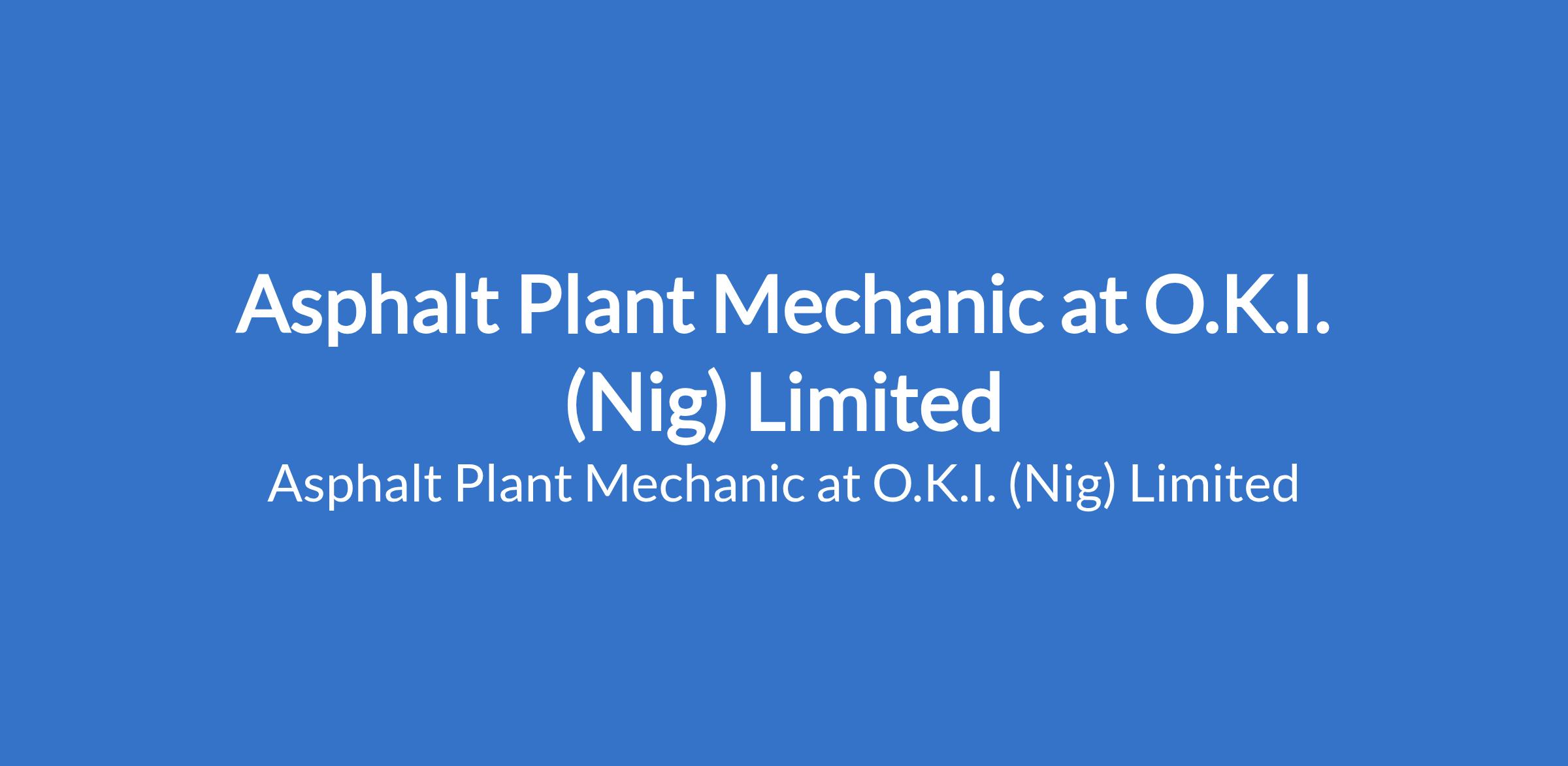 O.K.I. (Nig) Limited is recruiting to fill the position of: Asphalt Plant Mechanic. The position is located in Port Harcourt, Rivers State. Interested candidates should possess a relevant qualification with 4+ years of experience in heavy industrial maintenance.