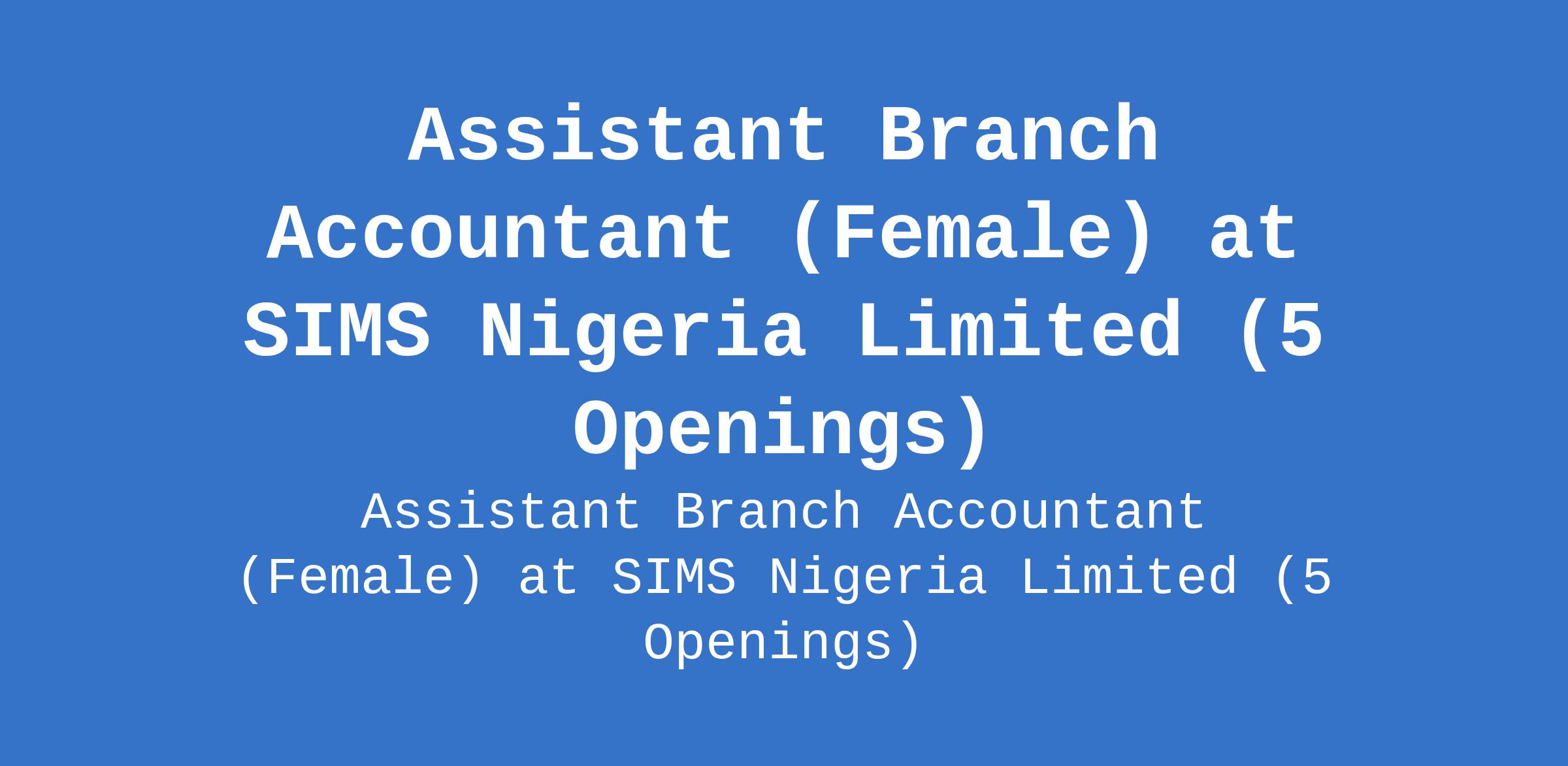 SIMS Nigeria Limited is recruiting to fill the position of: Assistant Branch Accountant (Female). The position is located in Abuja, Ogba, Amuwo-Odofin and ICM - Lagos, Owerri - Imo, Port Harcourt - Rivers and Enugu States. Interested candidates should possess an HND / Bachelor's Degree (minimum of a 2nd Class Degree) in Finance, Accounting or any other related field (Membership of a recognized professional body i.e. ICAN, ACCA will be an added advantage) with 1 - 2 years experience in a similar role.