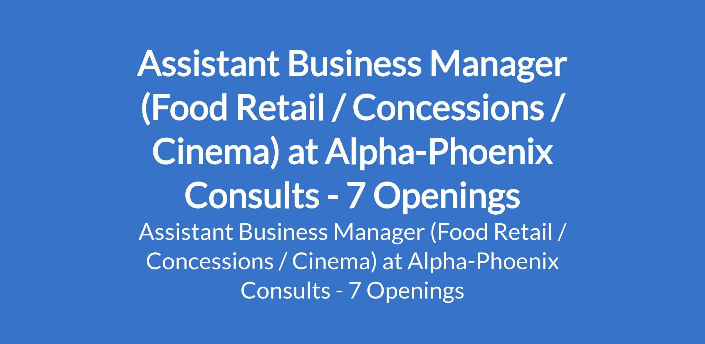 Alpha-Phoenix Consults is recruiting to fill the position of: Assistant Business Manager. The position is located in Abuja, Port Harcourt - Rivers, Asaba, Warri - Delta, Owerri - Imo, Awka - Anambra & Lagos States. Salary: N250,000 monthly. Interested candidates should possess a B.Sc. Degree or HND with proven experience in food retail, concessions, or cinema operations.
