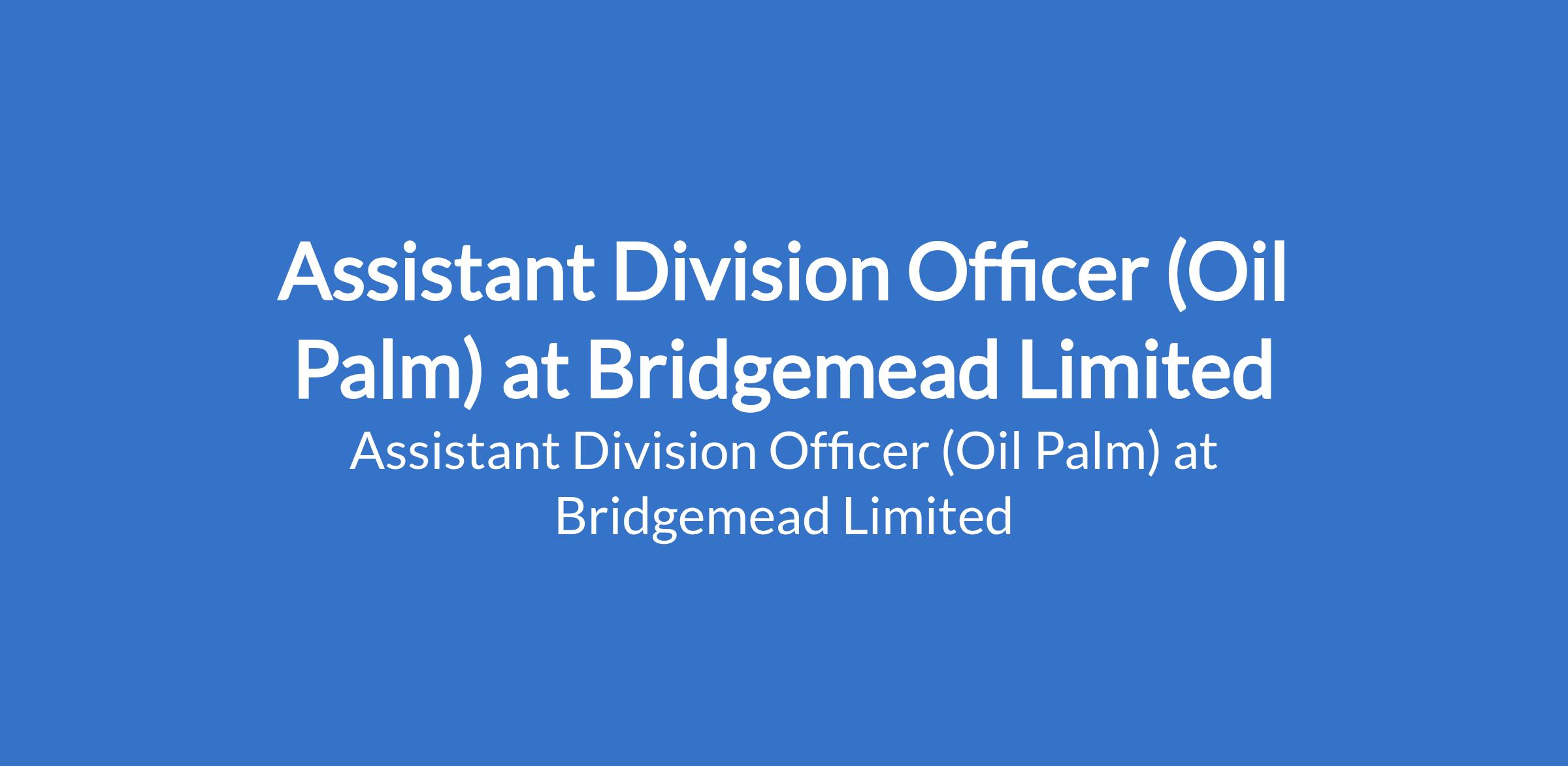 Bridgemead Limited is recruiting to fill the position of: Assistant Division Officer (Oil Palm). The position is located in Lagos State. Interested candidates should possess a Bachelors Degree in Agriculture, Agricultural Engineering, Agronomy, or related field; a Masters Degree in Business Administration (MBA), Agricultural Economics, or related field (optional) with 3 - 5 years of experience in oil palm plantation management; certification is an added advantage.