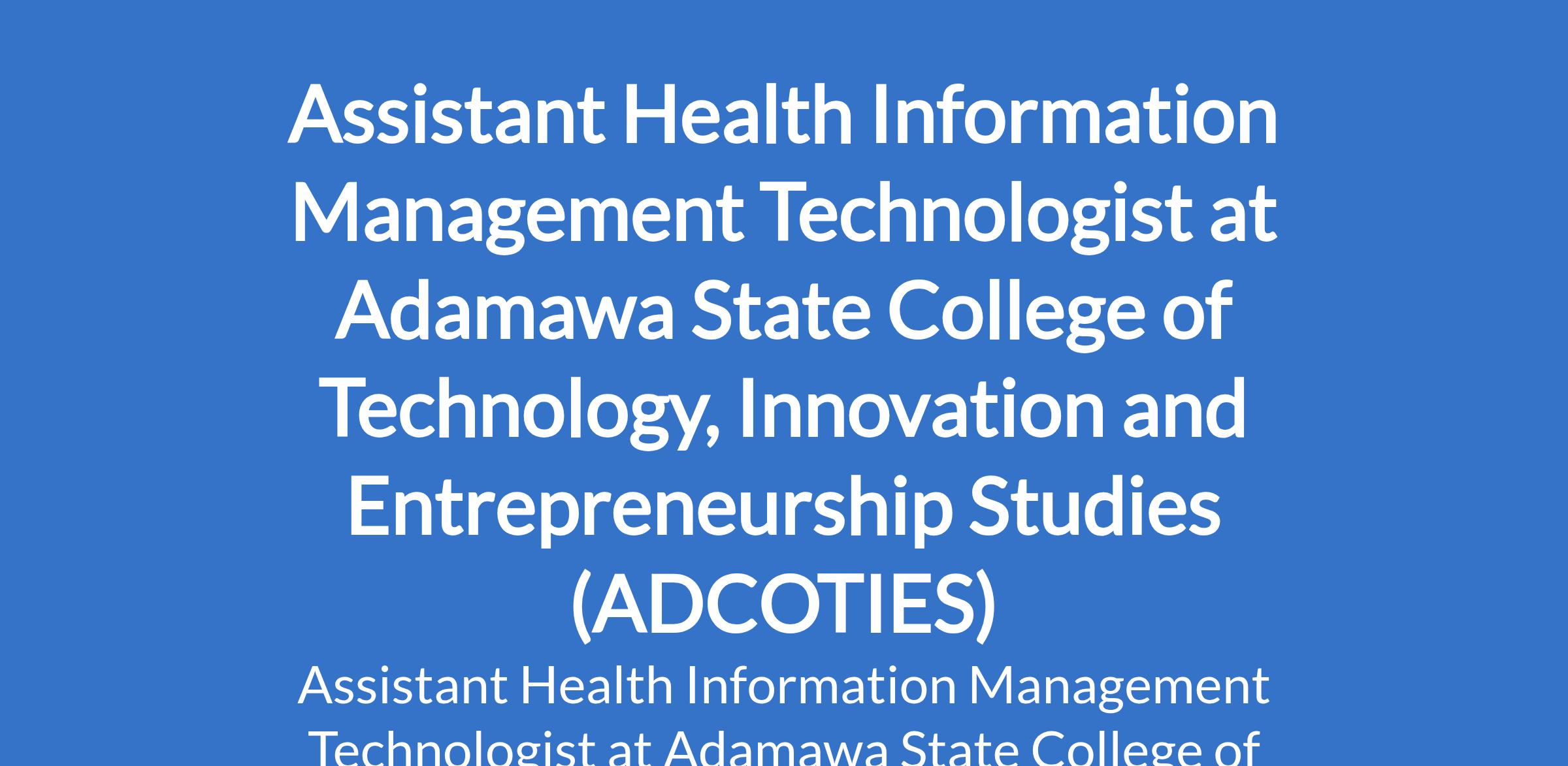 Adamawa State College of Technology, Innovation and Entrepreneurship Studies (ADCOTIES) is recruiting to fill the position of: Assistant Health Information Management Technologist. The position is located in Gulak, Adamawa State. Interested candidates should possess an ND in Health Informatics, Medical Record Science, Health Record & Info-Tech, Health Info Management at Credit Level from a recognised School of Health Teach. and registered with the Health Record Board.