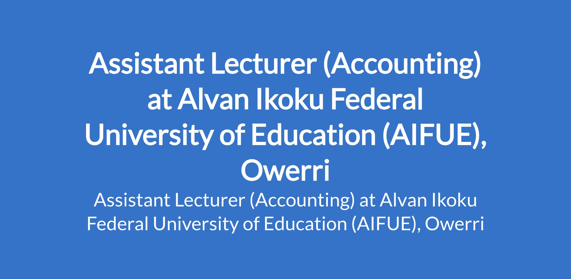 Alvan Ikoku Federal University of Education (AIFUE), Owerri invites applications from suitably qualified candidates for the position of: Assistant Lecturer (Accounting). The position is located in Imo State. Interested candidates should possess a Master's Degree in the relevant field. Evidence of research potential is desirable.