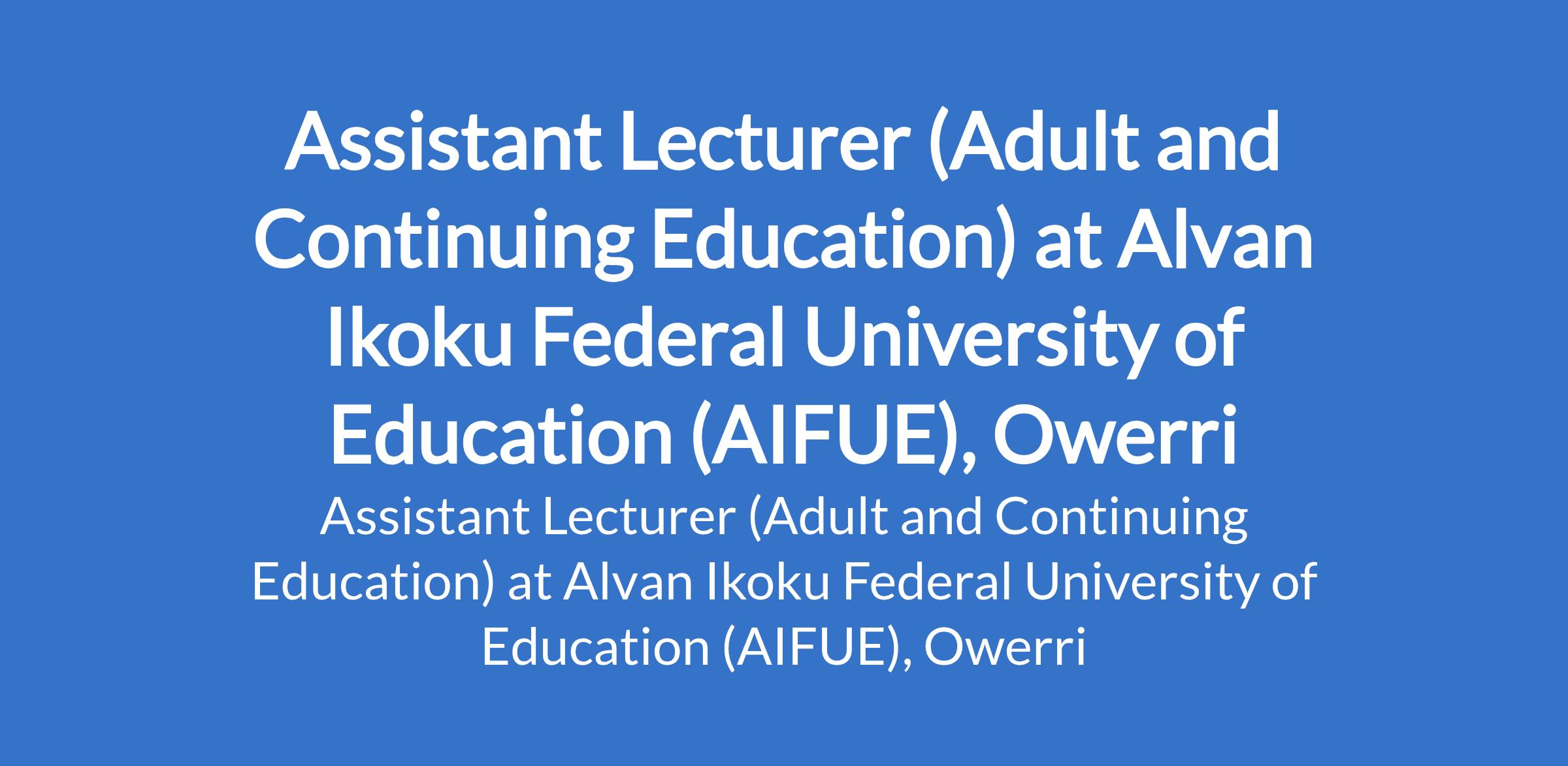 Alvan Ikoku Federal University of Education (AIFUE), Owerri invites applications from suitably qualified candidates for the position of: Assistant Lecturer (Adult and Continuing Education). The position is located in Imo State. Interested candidates should possess a Master's Degree in the relevant field. Evidence of research potential is desirable.