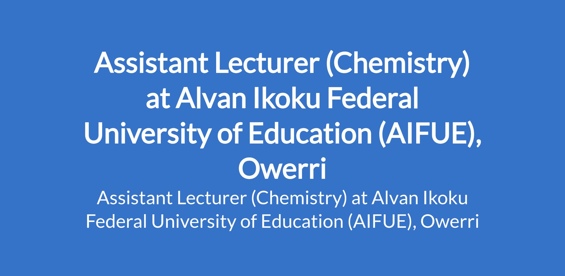 Alvan Ikoku Federal University of Education (AIFUE), Owerri invites applications from suitably qualified candidates for the position of: Assistant Lecturer (Chemistry). The position is located in Imo State. Interested candidates should possess a Master's Degree in the relevant field. Evidence of research potential is desirable.