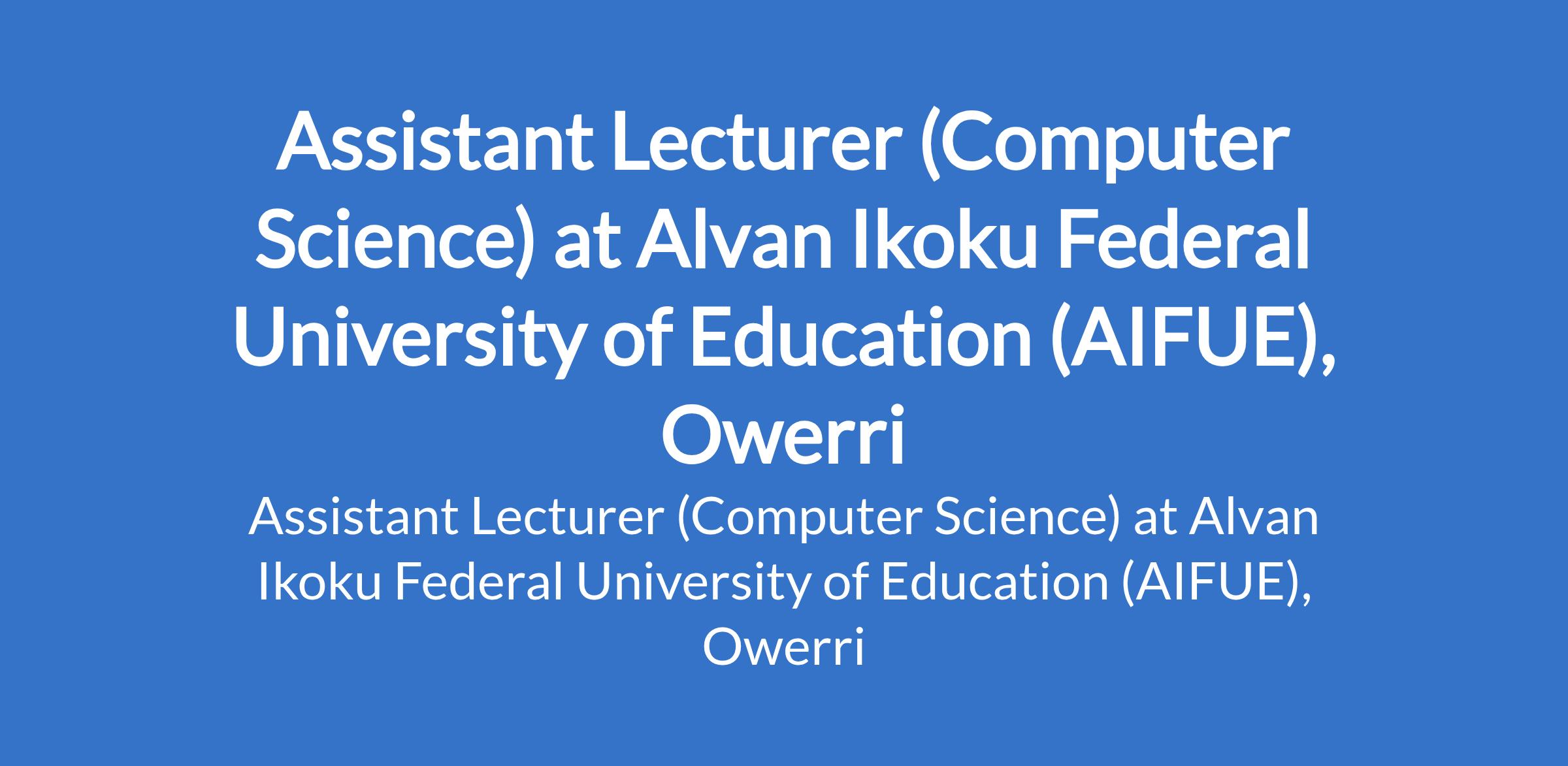 Alvan Ikoku Federal University of Education (AIFUE), Owerri invites applications from suitably qualified candidates for the position of: Assistant Lecturer (Computer Science). The position is located in Imo State. Interested candidates should possess a Master's Degree in the relevant discipline.