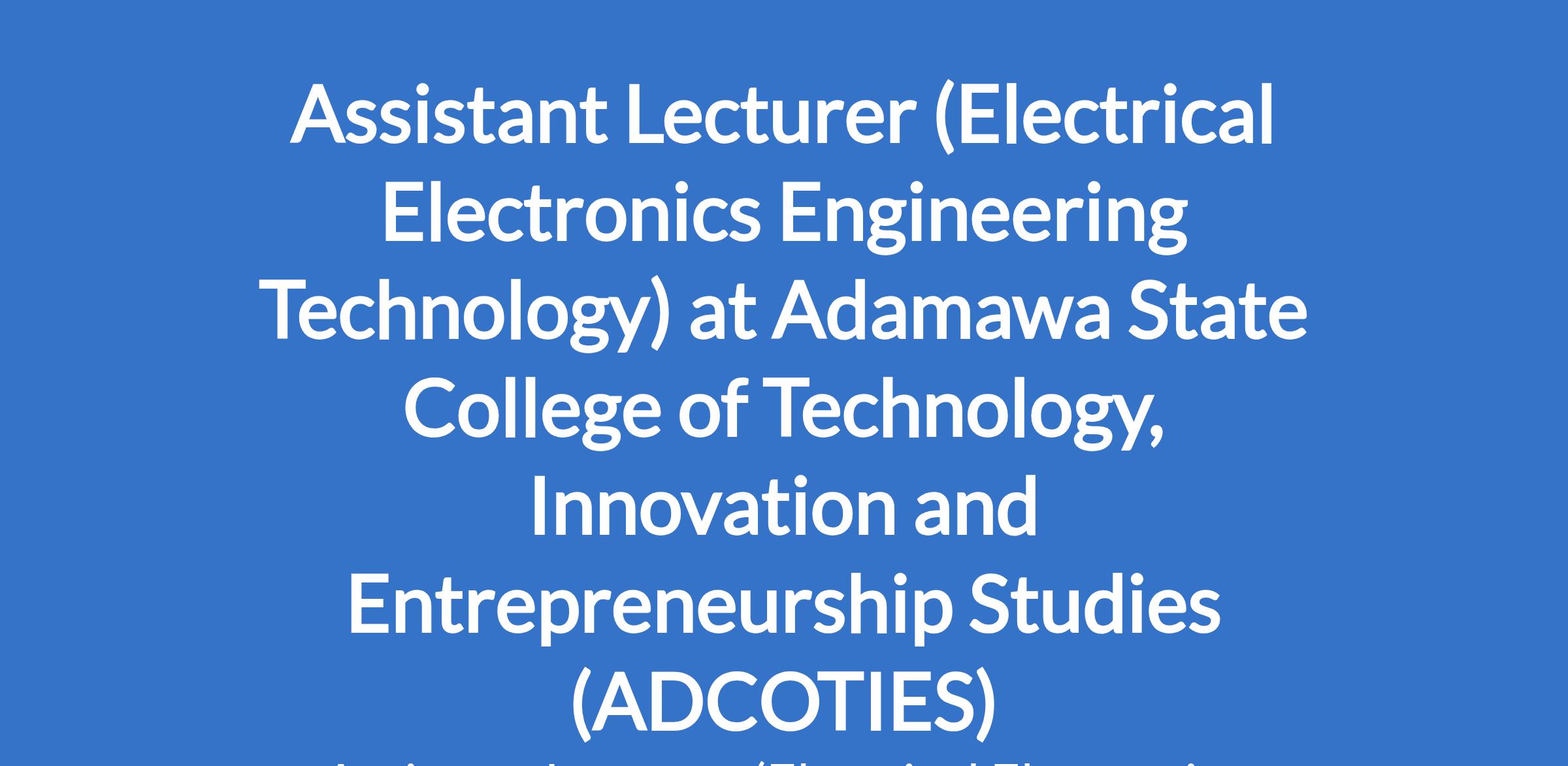 Adamawa State College of Technology, Innovation and Entrepreneurship Studies (ADCOTIES) is recruiting to fill the position of: Assistant Lecturer (Electrical Electronics Engineering Technology). The position is located in Gulak, Adamawa State. Interested candidates should possess a Master's Degree in relevant disciplines from a recognised institution plus NYSC discharge or exemption certificate.