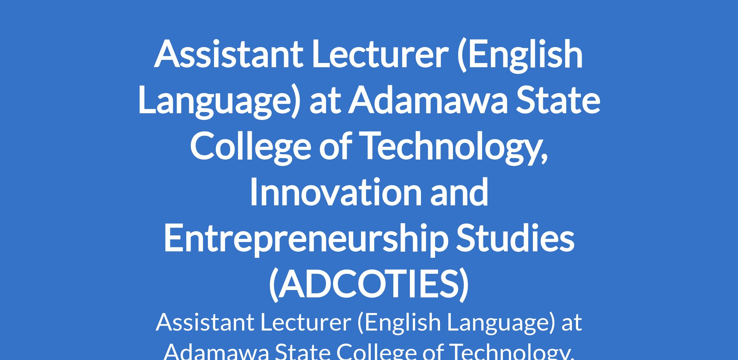 Adamawa State College of Technology, Innovation and Entrepreneurship Studies (ADCOTIES) is recruiting to fill the position of: Assistant Lecturer (English Language). The position is located in Gulak, Adamawa State. Interested candidates should possess a Masters Degree in a relevant discipline from a recognized institution plus NYSC discharge or exemption certificate.