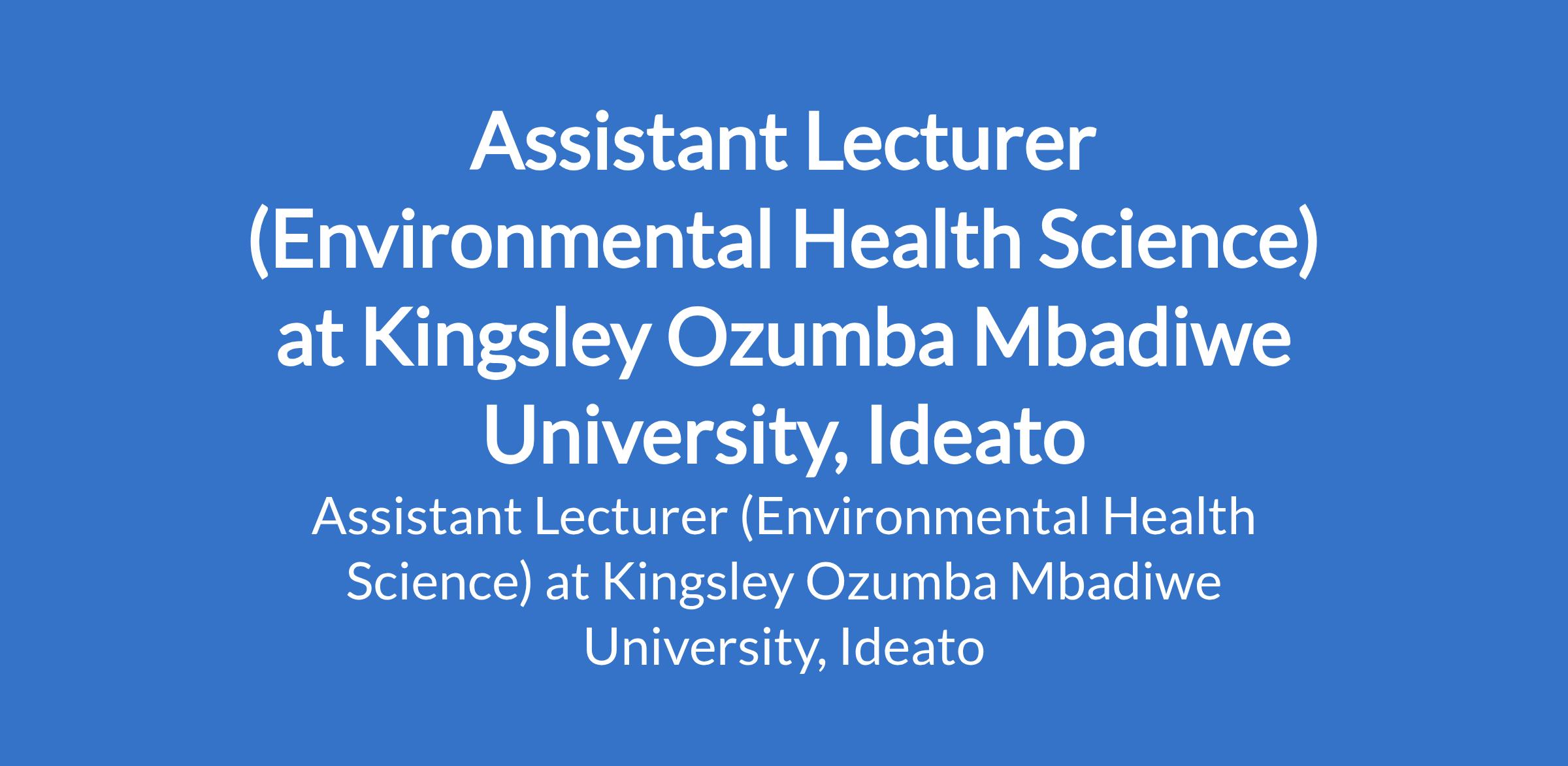 Kingsley Ozumba Mbadiwe University, Ideato invites applications for the position of: Assistant Lecturer (Environmental Health Science). The position is located in Imo State. Interested candidates should possess a Master's Degree in the relevant field.