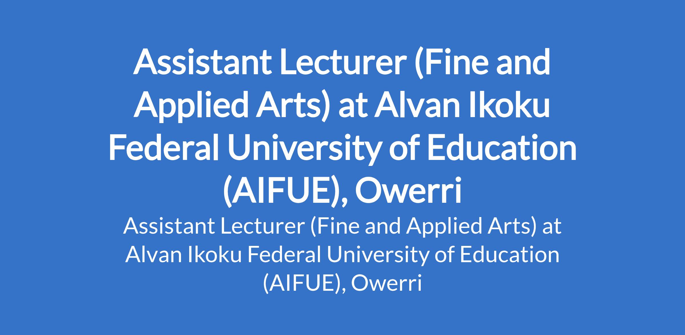 Alvan Ikoku Federal University of Education (AIFUE), Owerri invites applications from suitably qualified candidates for the position of: Assistant Lecturer (Fine and Applied Arts). The position is located in Imo State. Interested candidates should possess a Master's Degree in the relevant field. Evidence of research potential is desirable.