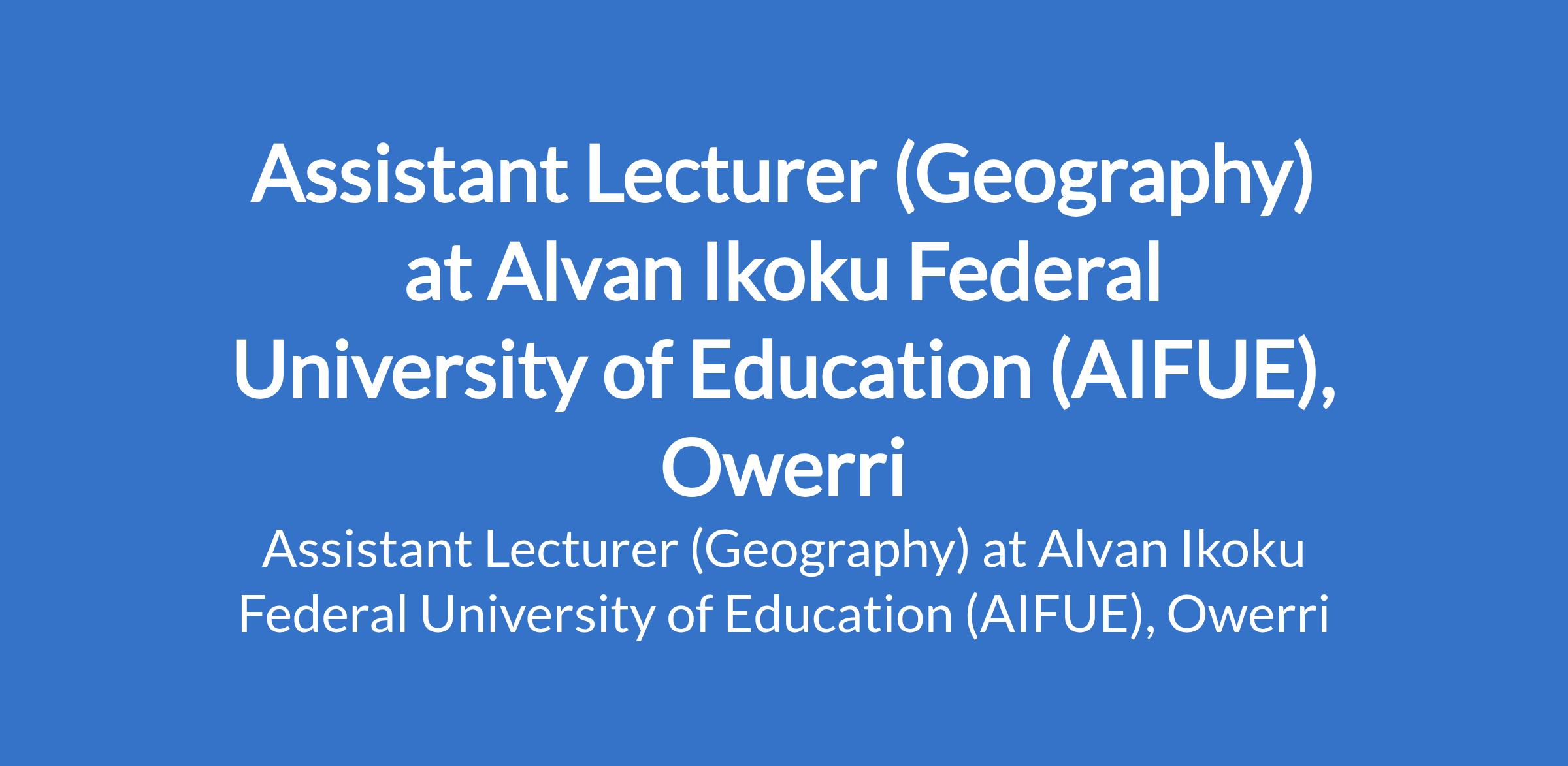 Alvan Ikoku Federal University of Education (AIFUE), Owerri invites applications from suitably qualified candidates for the position of: Assistant Lecturer (Geography). The position is located in Imo State. Interested candidates should possess a Master's Degree in the relevant field. Evidence of research potential is desirable.