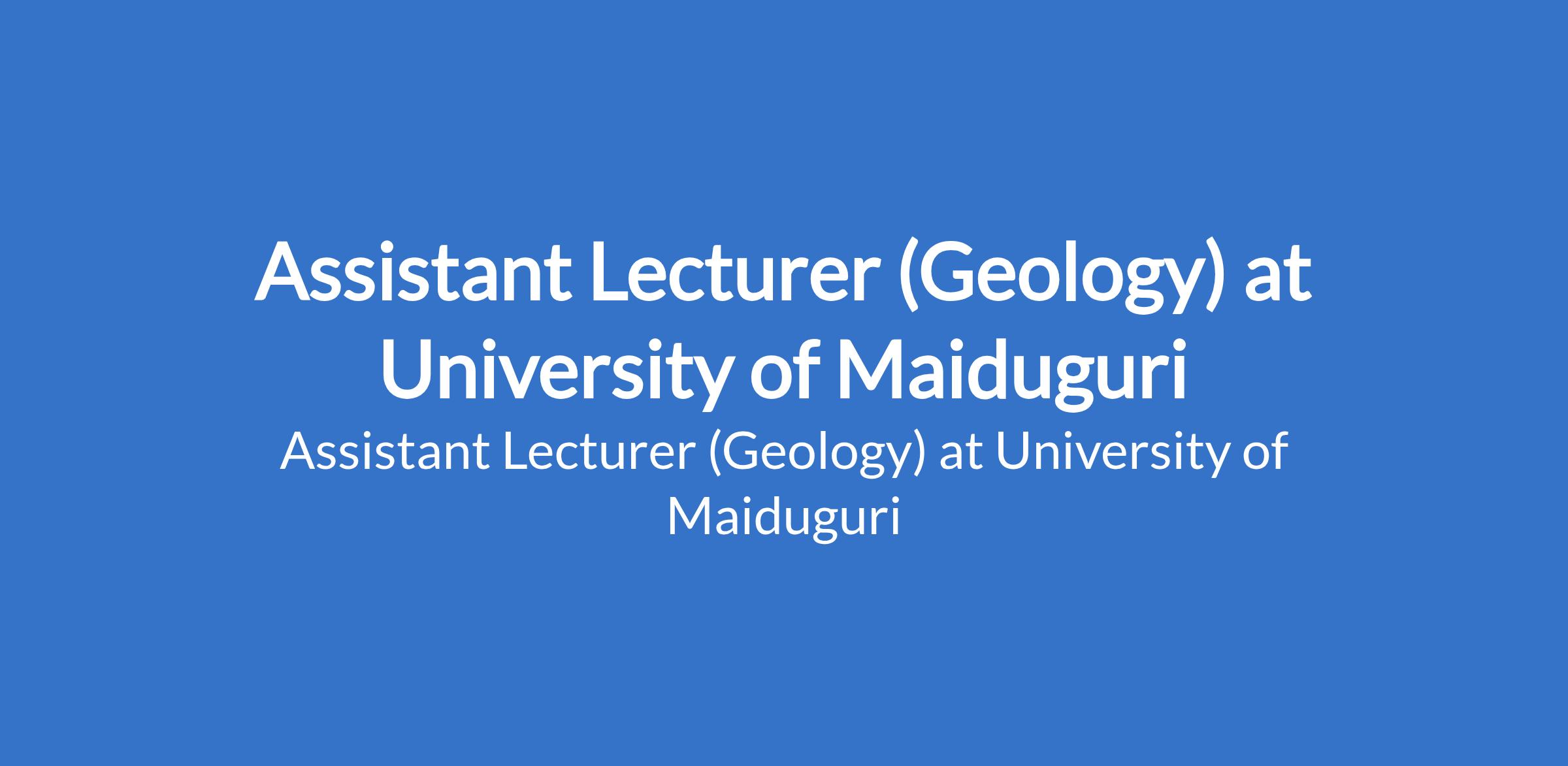 University of Maiduguri invites applications from suitable candidates to fill the position of: Assistant Lecturer (Geology). The position is located in Borno State. Interested candidates should possess a Master's Degree from University of Maiduguri or another recognised institution or a First Class / Second Class Upper Degree with relevant professional qualification where applicable.