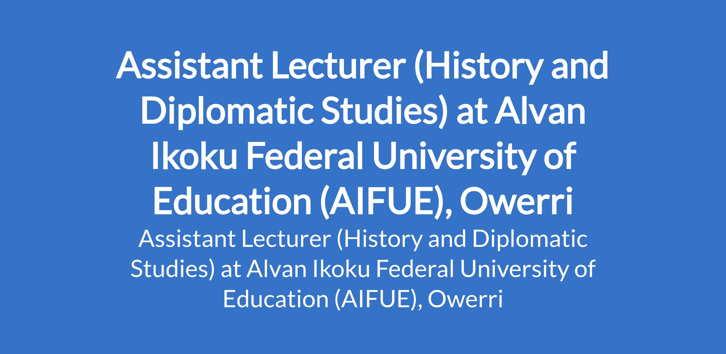 Alvan Ikoku Federal University of Education (AIFUE), Owerri invites applications from suitably qualified candidates for the position of: Assistant Lecturer (History and Diplomatic Studies). The position is located in Imo State. Interested candidates should possess a Master's Degree in the relevant field. Evidence of research potential is desirable.