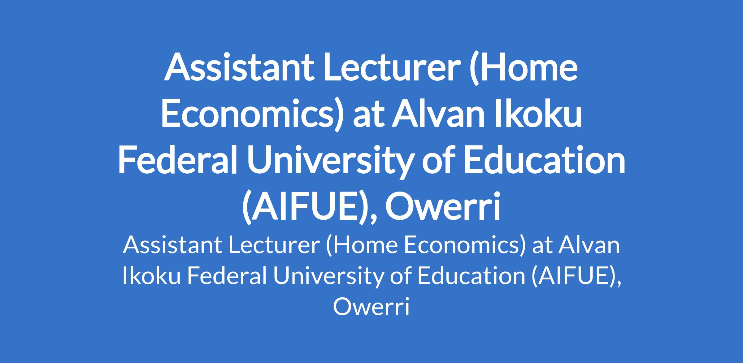 Alvan Ikoku Federal University of Education (AIFUE), Owerri invites applications from suitably qualified candidates for the position of: Assistant Lecturer (Business Education). The position is located in Imo State. Interested candidates should possess a Master's Degree in the relevant discipline.