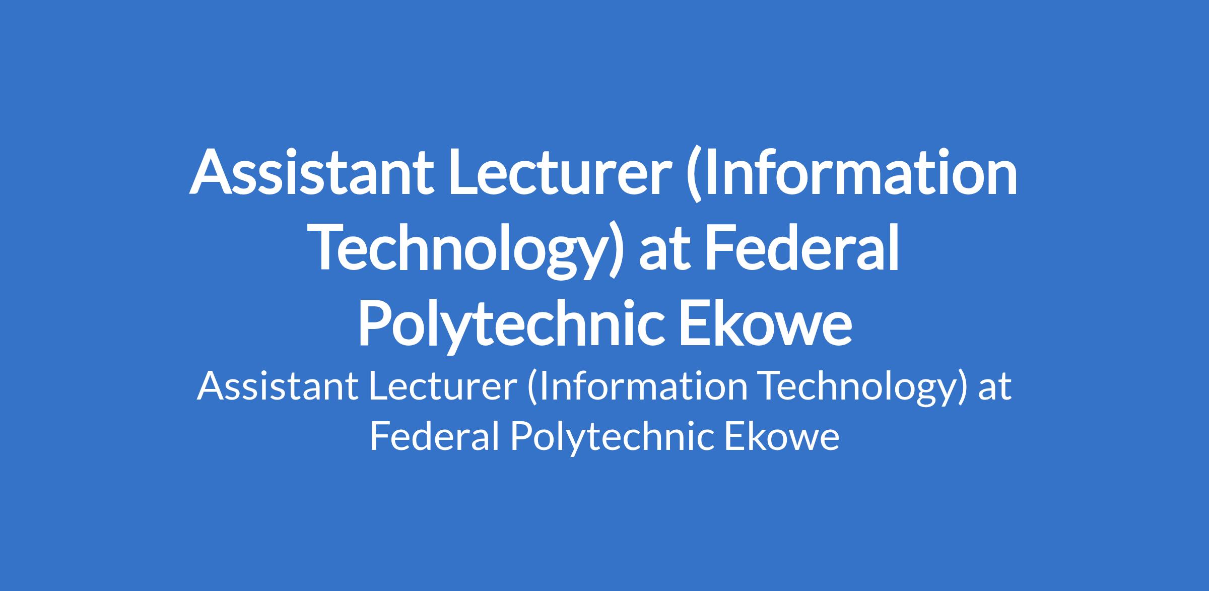 The Federal Polytechnic Ekowe invites applications from suitably qualified candidates for the position of: Assistant Lecturer (Information Technology). The position is located in Bayelsa State. Interested candidates should possess a Bachelor's Degree (Minimum of Second-Class Lower Division) in the relevant field from a recognized institution, plus NYSC Certificate.