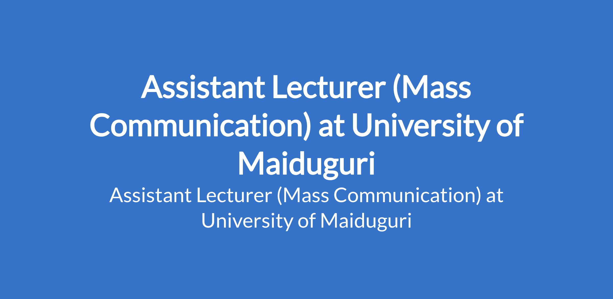 University of Maiduguri invites applications from suitable candidates to fill the position of: Assistant Lecturer (Mass Communication). The position is located in Borno State. Interested candidates should possess a Master's Degree from University of Maiduguri or another recognised institution or a First Class / Second Class Upper Degree with relevant professional qualification where applicable.