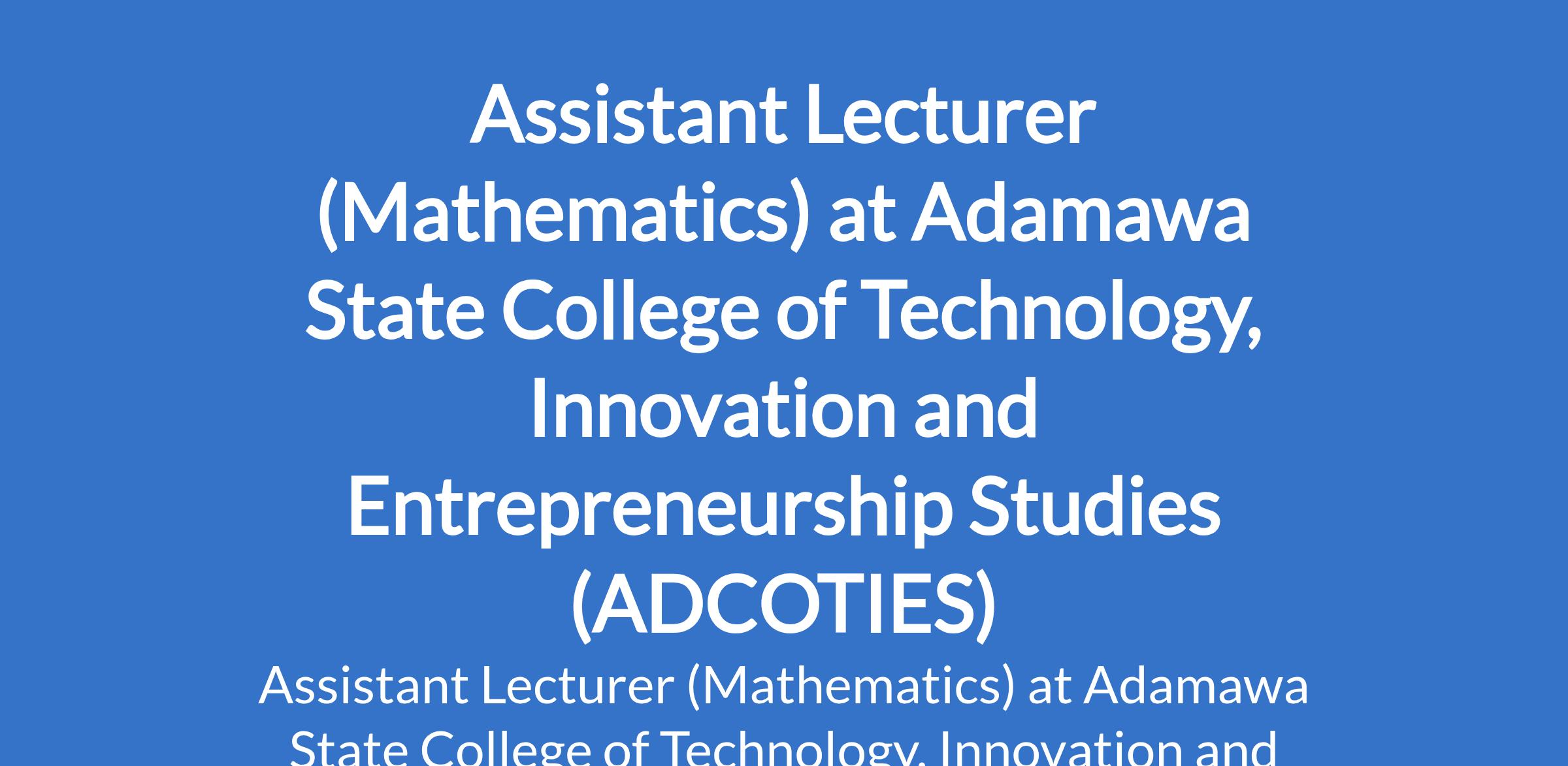 Adamawa State College of Technology, Innovation and Entrepreneurship Studies (ADCOTIES) is recruiting to fill the position of: Assistant Lecturer (Mathematics). The position is located in Gulak, Adamawa State. Interested candidates should possess a Masters Degree in a relevant discipline from a recognized institution plus NYSC discharge or exemption certificate.