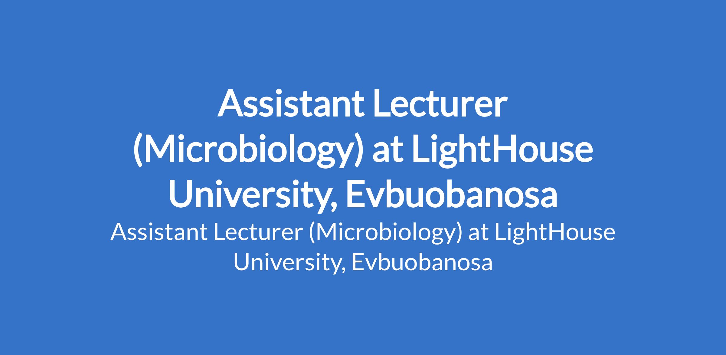 LightHouse University, Evbuobanosa invites applications from suitably qualified candidates to fill the position of: Assistant Lecturer (Microbiology). The position is located in Edo State. Interested candidates should possess Candidates should possess a Ph.D Degree in relevant field or evidence of Ph.D defense required with experience.